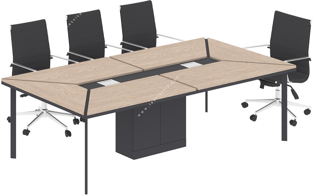 Sağlam metal ayaklar ve merkezi kolon yapısı, masaya üstün dayanıklılık ve modern bir duruş kazandırır. Yüksek kaliteli materyallerle üretilen sekiz kişilik toplantı masası, uzun ömürlü kullanım vadederek iş yerinizin teknolojik ve estetik beklentilerini bütünüyle karşılar.