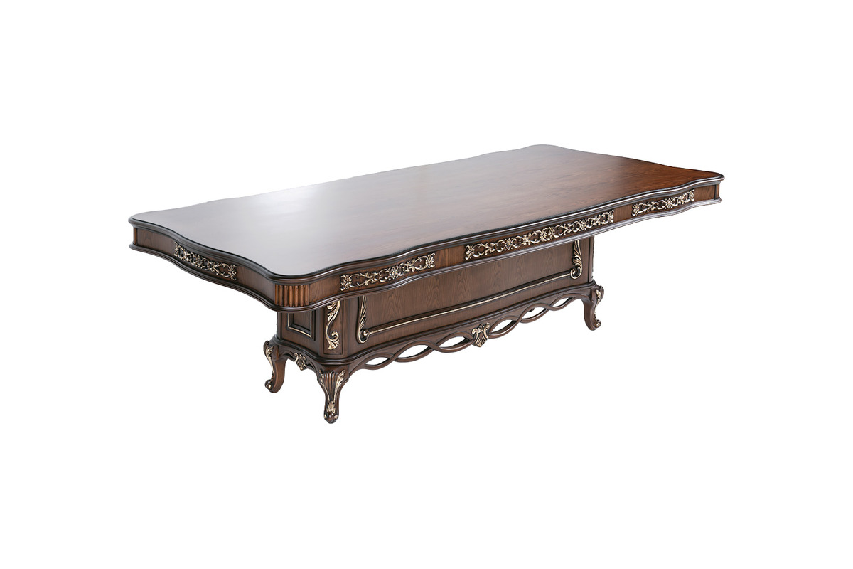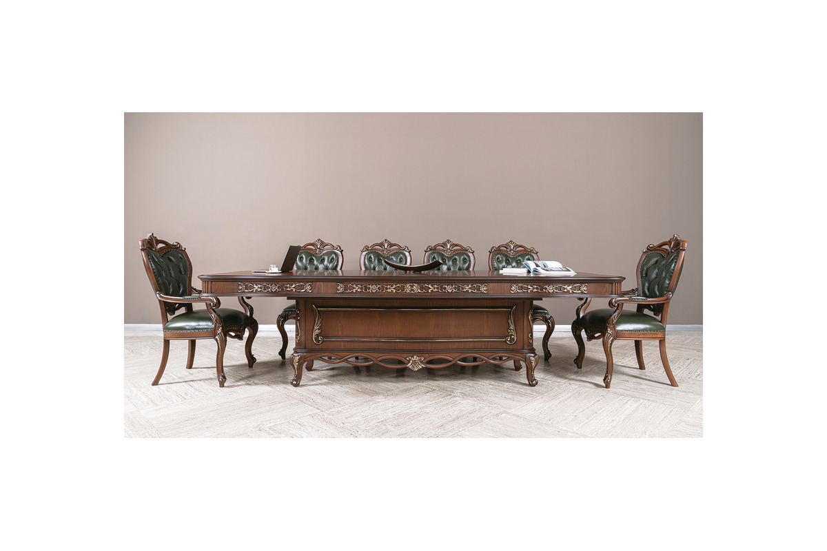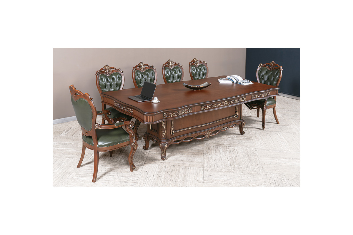 Felmirano Klasik Toplantı Masası, ofisinizdeki toplantı odasına geleneksel bir zarafet ve etkileyici bir görünüm kazandırmak üzere tasarlanmıştır. Ahşap kaplaması ve masanın kenarlarındaki ince oyma detayları, ürüne klasik bir estetik ve sofistike bir hava katar. Dikdörtgen geniş üst yüzeyi, kalabalık katılımlı toplantılar için rahat ve işlevsel bir alan sunar. Sağlam ve gösterişli ayak yapısı, masanın dengeli ve ağırbaşlı duruşunu destekler. Bu klasik toplantı masası, sadece bir çalışma alanı olmanın ötesinde, ofisinizin profesyonel imajını yansıtan önemli bir klasik mobilya parçasıdır.