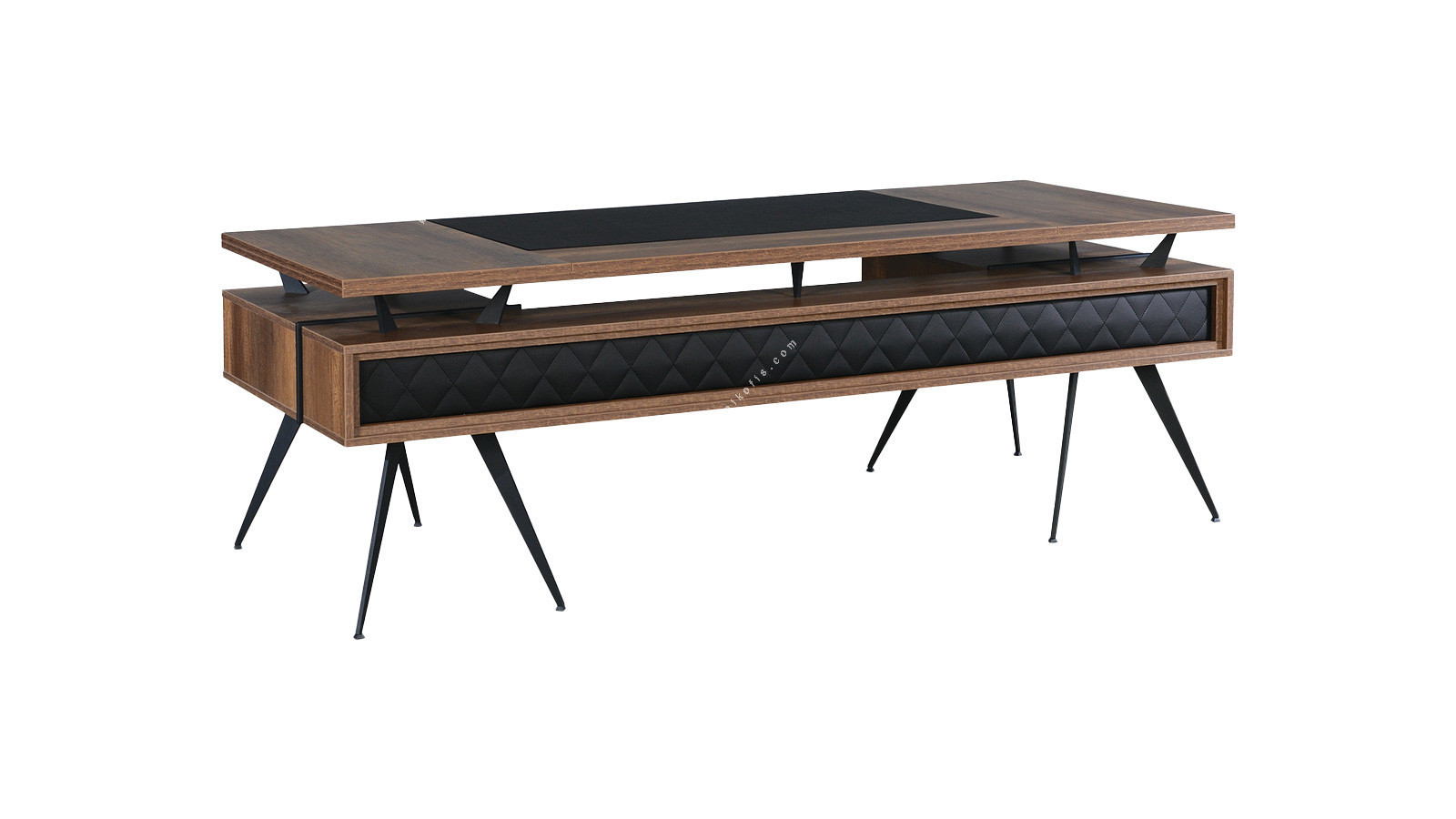 Çalışma alanınıza modern bir estetik ve üst düzey bir prestij katmak üzere tasarlanan Beshon Yönetici Çalışma Masası, işlevsellik ve zarafetin mükemmel birleşimini sunar. Masanın geniş ve düz ahşap yüzeyi, verimli bir çalışma alanı sağlarken, entegre edilmiş siyah deri tabla detayı hem konforu artırır hem de lüks bir dokunuş ekler. Ön cephede yer alan, dikkat çekici geometrik desenli siyah deri panel, masaya benzersiz bir karakter ve derinlik kazandırır. Eğik formdaki siyah metal ayaklar, tasarıma modern ve dinamik bir hava katar. Beshon yönetici masası, güçlü ve etkileyici tasarımıyla, liderlik vasfınızı yansıtan bir ofis ortamı yaratmanız için idealdir.