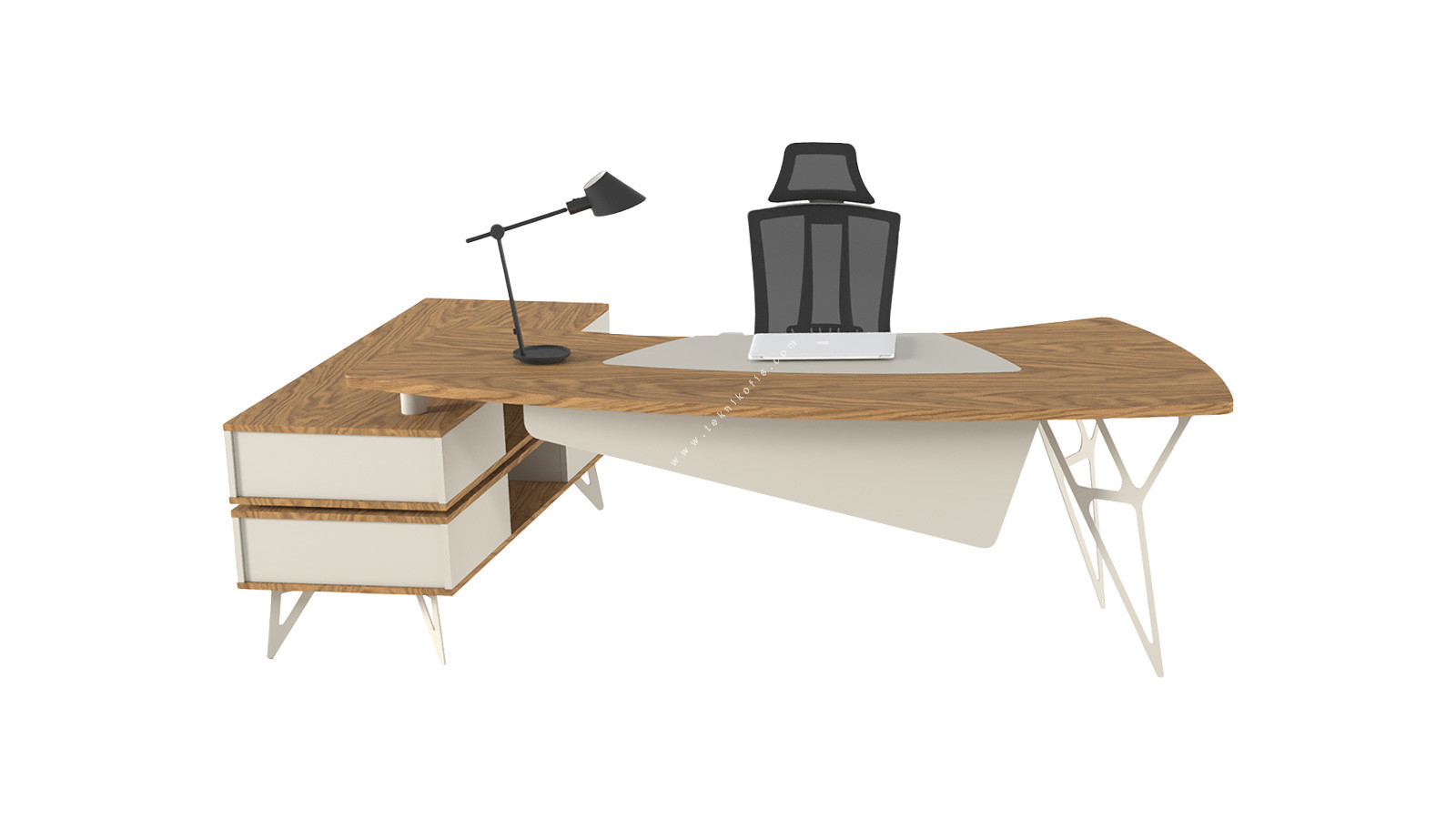 Coral Plus Etajerli Ofis Masası, çağdaş yönetici ofislerinin ihtiyaçları düşünülerek tasarlanmış şık ve fonksiyonel bir mobilya parçasıdır. Masanın geniş ve kavisli ahşap üst tablası, çalışma alanına estetik bir dokunuş katarken, entegre sağ etajer ek depolama ve çalışma alanı sunar. Etajerdeki çekmeceler, evrakların düzenli bir şekilde saklanmasına olanak tanır.