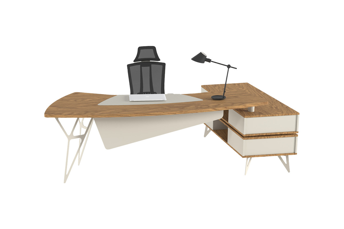 Coral Plus Sol Etajerli Makam Masası, çağdaş yönetici ofislerinin ihtiyaçları düşünülerek tasarlanmış şık ve fonksiyonel bir mobilya parçasıdır. Masanın geniş ve kavisli ahşap üst tablası, çalışma alanına estetik bir dokunuş katarken, entegre sol etajer ek depolama ve çalışma alanı sunar. Etajerdeki çekmeceler, evrakların düzenli bir şekilde saklanmasına olanak tanır.