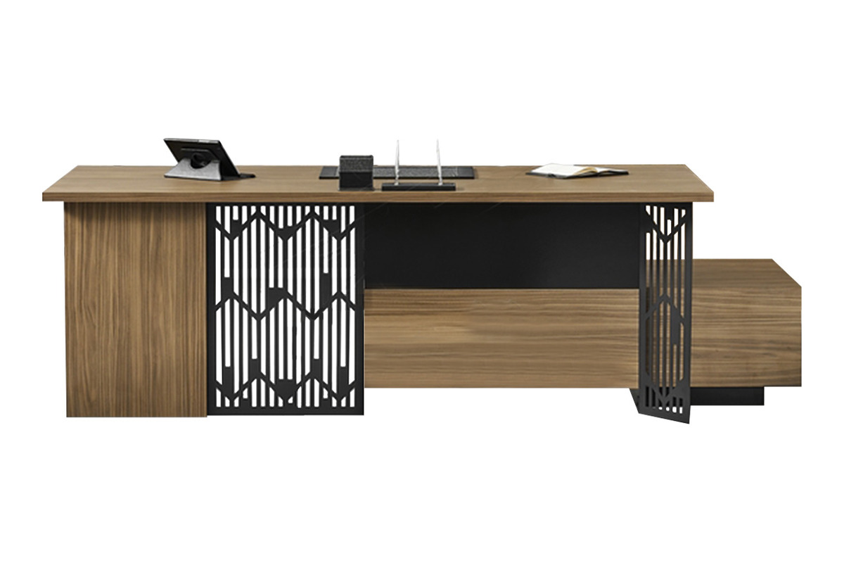 Homeros Modern Ayaklı Yönetici Masası, metal kesim detaylı ayak tasarımı ve modern çizgileriyle prestijli ofisler için tasarlanmış şık bir yönetici masası modelidir. Geniş ve fonksiyonel tabla yapısı sayesinde yoğun iş temposuna uygun çalışma alanı sunan bu modern yönetici masası, hem estetik hem de konforlu bir kullanım sağlar.