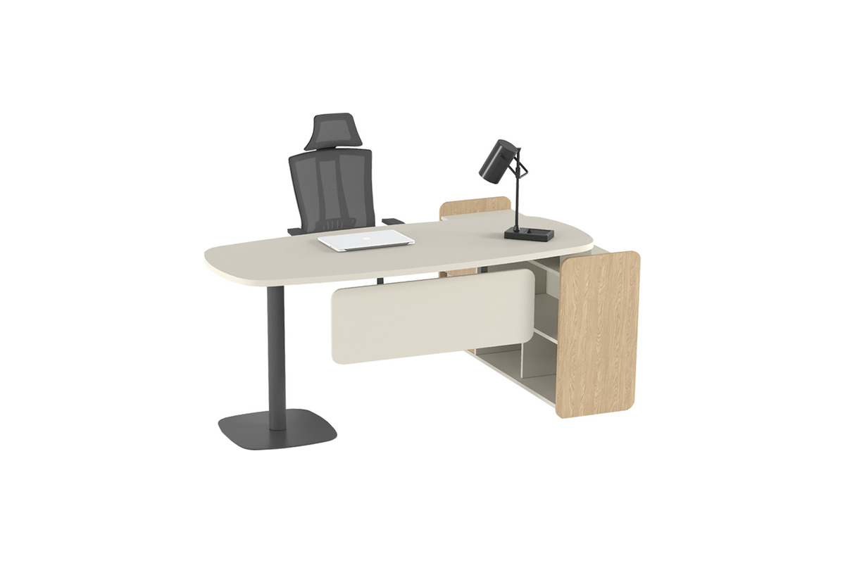 Karmil Plus Sol Etajerli Yönetici Masası, modern yönetici ofisleri için tasarlanmış, ergonomi ve estetiği birleştiren işlevsel bir mobilyadır. Masanın yuvarlatılmış kenarlı tablası, kullanıcıya geniş ve konforlu bir çalışma alanı sunar. Masa, sağ tarafta yer alan koyu renkli, tekli metal ayak ve sol tarafta entegre edilmiş, ahşap detaylı etajer ile desteklenmektedir.