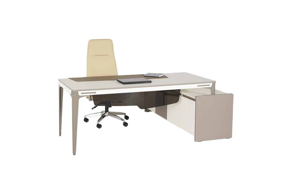 Yönetici ofisinizin prestijini artıran, her detayıyla dikkat çeken Lestonplus Etajerli Ahşap Yönetici Masası ile tanışın. Bu yönetici masa takımının ana unsuru olan masa, bej ve beyazın sofistike birlikteliğiyle çalışma alanınıza ferah ve modern bir atmosfer katıyor. İnce ve zarif metal ayaklar, masaya hafif bir görünüm kazandırırken, sağlamlığını da garanti altına alır. Masanın altında yer alan entegre panel, hem görsel bir bütünlük sağlar hem de kablo yönetimi için pratik bir çözüm sunar.