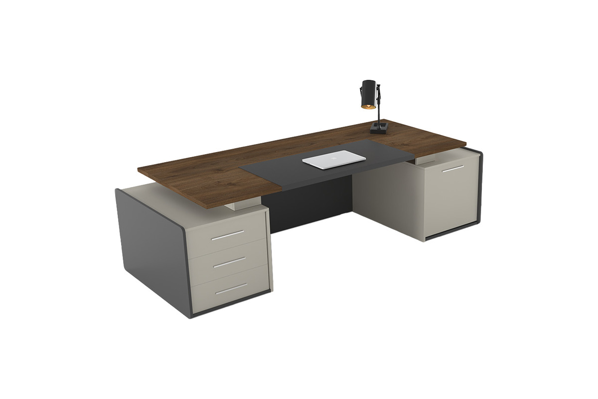 Luxora Makam Masası, çağdaş yönetici ofisleri için tasarlanmış, hem estetik hem de fonksiyonel açıdan üst düzey bir mobilyadır. Masanın geniş ahşap görünümlü üst tablası, konforlu bir çalışma alanı sunar. Masanın ön kısmında bulunan dikey çizgili panel ve yanlardaki ahşap detaylar, tasarıma modern ve dinamik bir hava katar.