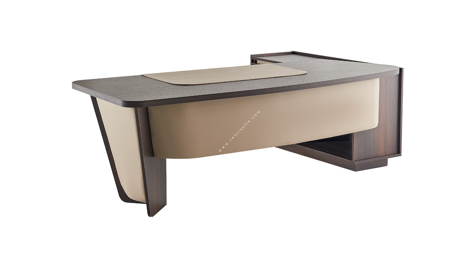 Magnario Yönetici Çalışma Masası, yöneticilerin ihtiyaçları göz önünde bulundurularak tasarlanmış son derece fonksiyonel bir üründür. Geniş ve kavisli çalışma yüzeyi, rahat bir çalışma alanı sağlarken, masanın ön kısmındaki deri detaylar konforu artırır. Entegre etajeri, önemli belgeler ve ofis malzemeleri için ek depolama alanı sunar. Bu depolama çözümü, çalışma alanının dağınıklığını önleyerek düzenli ve verimli bir ortam yaratır. Deri detaylı masanın sağlam yapısı, uzun ömürlü ve dayanıklı bir kullanım vaat eder.
