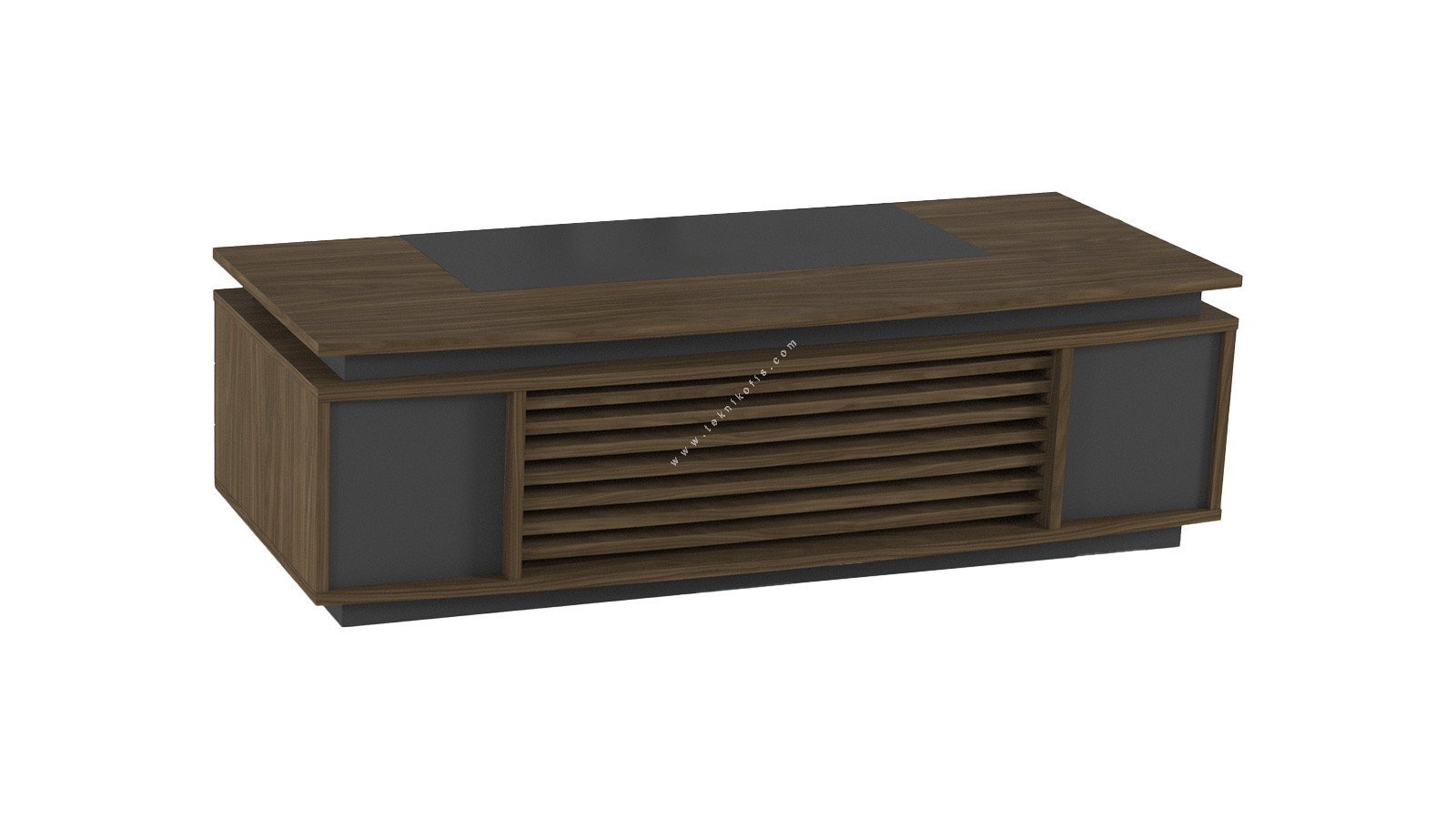 Özel işlemeli makam masası CNC makinelerinde işlenerek şekil verilerek tasarlanmıştır. Yapısında melamin lam kullanılarak imal edilmiş olup üzeri takılıp çıkarılabilen deri kaplama sümenli yapıdadır. Sümenli yapısı çalışma sırasında masanın zarar görmesini engellediği gibi çalışma sırasında konforlu bir yapı sunar. Makam çalışma masasının önü CNC ile işlenmiş masa perdelidir. Çalışma masası doğal ahşap görünümünde olması için melamin kaplama kullanılarak kaplanmıştır. Makam çalışma masasının genişliği 220 cm, derinliği 100 cm ve yüksekliği 75 cm olarak standart ölçülerde imal edilmektedir. Tercih etmeniz durumunda makam odanız için belirli ölçülere kadar özel imalat yapmaktayız.