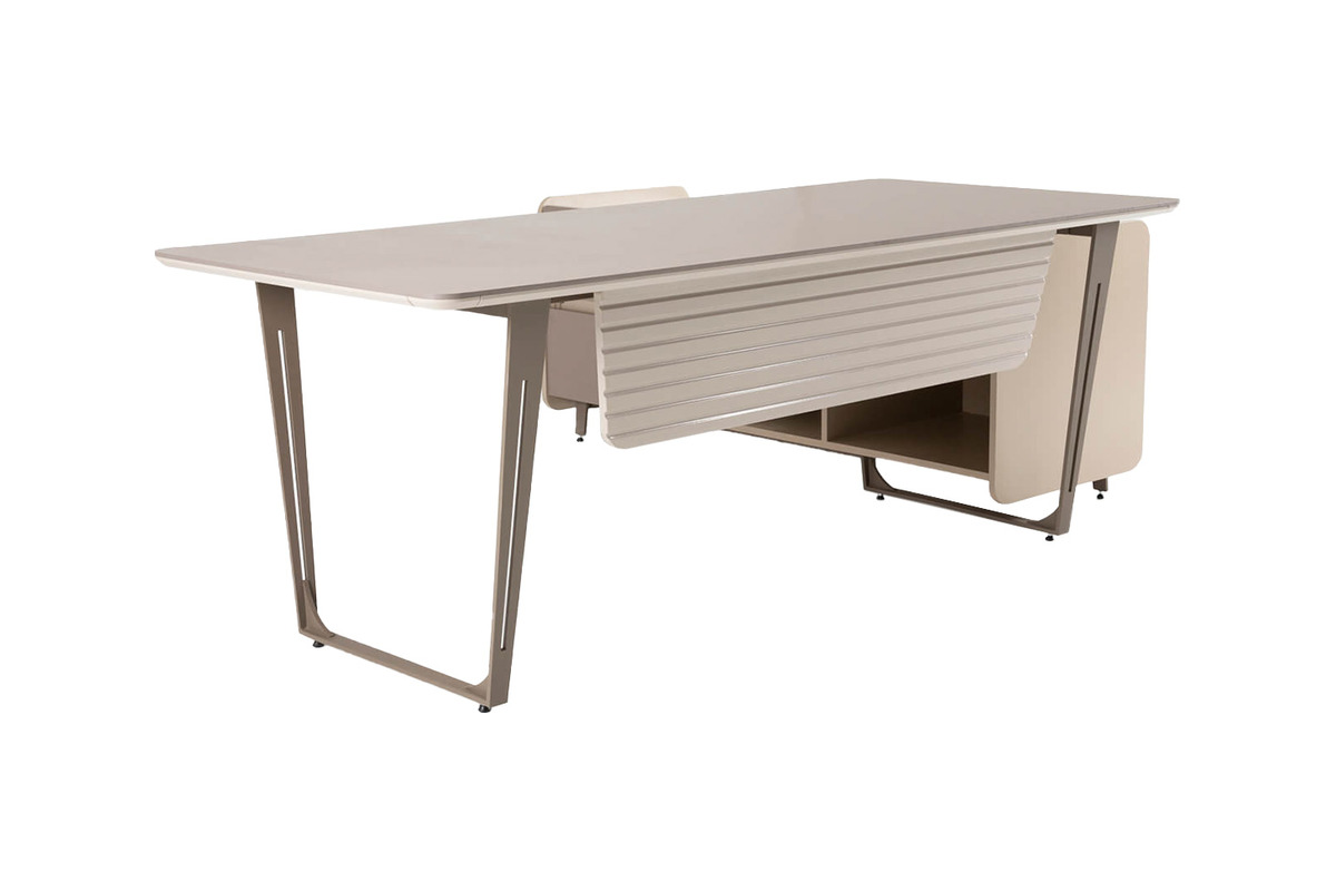 Yönetici ofisinize değer katacak Pesta Modern Yönetici Masası, estetiği ve ergonomiyi kusursuz bir şekilde bir araya getirir. Geniş ve pürüzsüz çalışma yüzeyi, gün boyu konforlu bir kullanım sağlarken, masanın alt kısmında yer alan ve yatay şeritlerle zenginleştirilmiş zarif ön panel, tasarıma özgün bir doku ve görsel derinlik katar. Sağlam metalik renkteki geometrik bacaklar, masanın modern duruşunu pekiştirirken, yan tarafta yer alan entegre etajer, depolama ve düzenleme ihtiyaçlarınız için pratik çözümler sunar. Pesta Yönetici Masası, sade ve şık tasarımıyla her türlü iç mekana kolayca uyum sağlayarak, profesyonel ve ilham verici bir çalışma ortamı yaratmanıza olanak tanır.