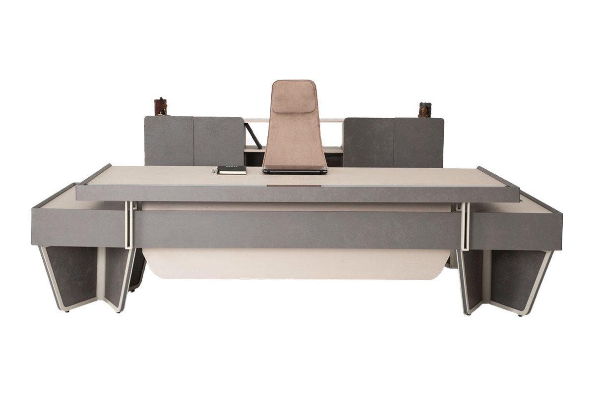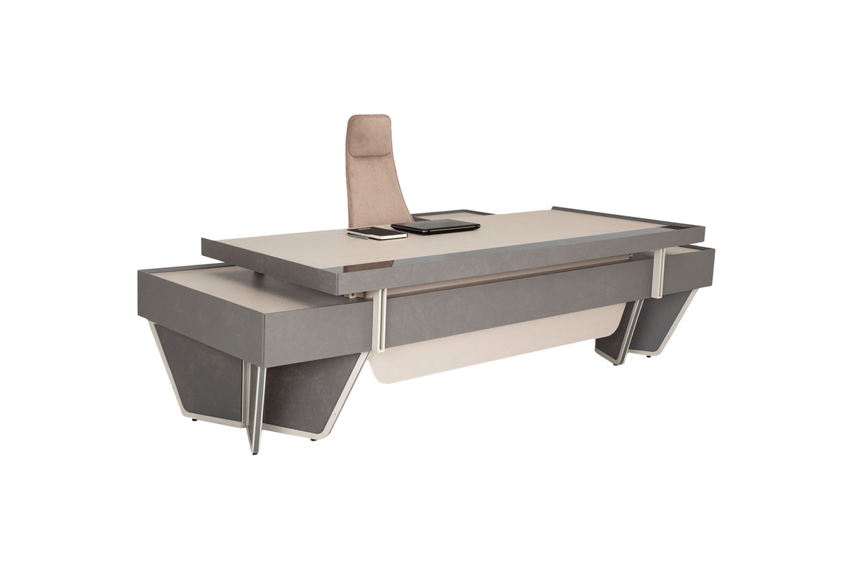Shade Yönetici Masası, melamin yüzeyi ve metal detaylarıyla modern ofis anlayışına uygun olarak tasarlanmış şık bir etajerli ofis masasıdır. Masaya entegre etajer, evrak ve ofis ekipmanları için düzenli bir depolama alanı sunarken, çalışma alanının verimli kullanılmasına yardımcı olur. Dayanıklı melamin malzeme uzun ömürlü kullanım sağlarken, metal detaylar masaya çağdaş ve güçlü bir karakter kazandırır. Yönetici ofisleri ve kurumsal çalışma alanları için ideal bir çözümdür.