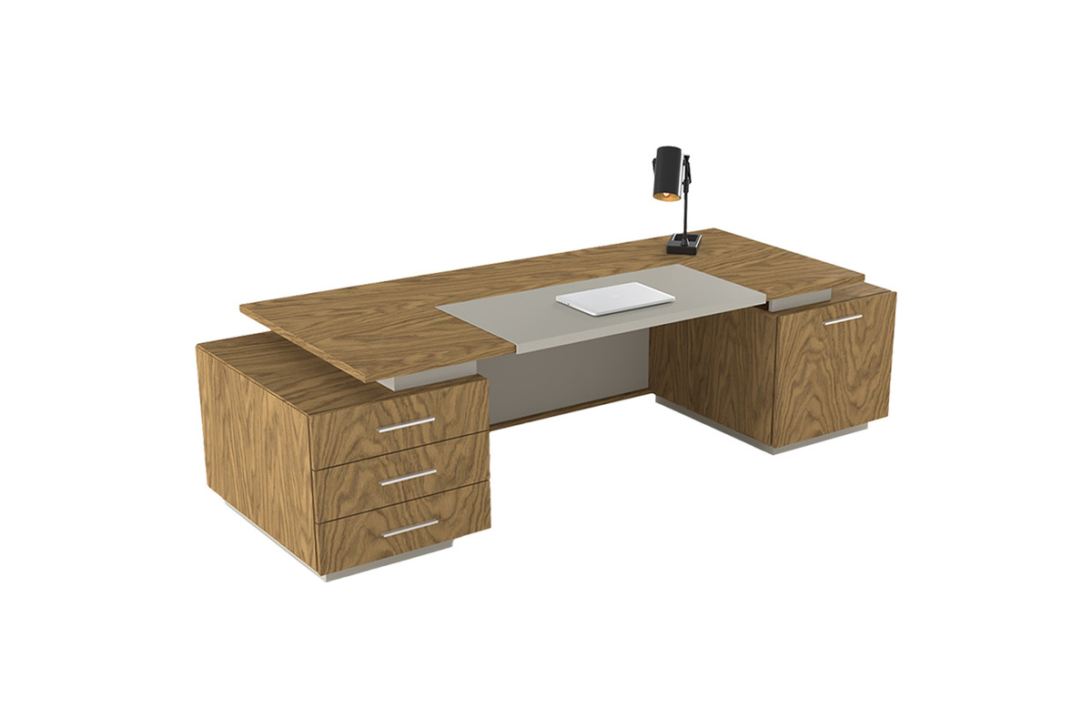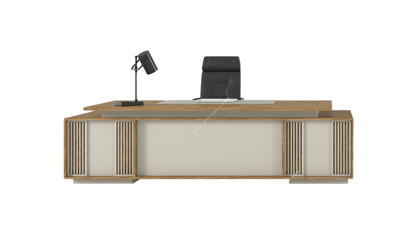 Soventra Yönetici Ofis Masası, yönetici ofisleri için tasarlanmış, hem estetik hem de fonksiyonel bir mobilya parçasıdır. Masanın geniş ahşap görünümlü tablası, çalışma alanı için ferah bir yüzey sunar. Masanın her iki yanında bulunan dikey çıtalar, klasik mobilya sanatına gönderme yaparken, aynı zamanda masaya özgün bir karakter kazandırır.