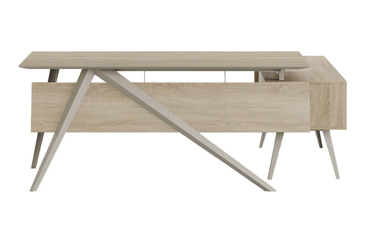 Thima Metal Tasarım Yönetici Masası, kullanıcısına verimli bir deneyim sunmak için geniş çalışma alanı sağlar. Masanın minimalist çizgilerle tasarlanmış yapısı, ofis ortamına ferahlık ve modern bir hava katarken, gereksiz kalabalıktan uzak bir görünüm sunar. Metal ayakların açılı ve özgün tasarımı, hem estetik bir detaydır hem de masaya sağlam bir temel oluşturur.