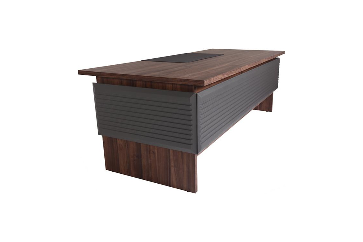 Makam odası çalışma masası 30 mm kalınlığında melamin tabladan imal edilmiş olup yüzeyi hem doğal ahşap görünümünde olması için hem de melaminin sağlam yapısı darbe ve çizilmelere karşı makam masasına dayanıklı yapı kazandırır. Makam çalışma masasının üzeri 2 mm sac üzerinde deri kaplamalı masaya takılıp çıkarılabilen sümenlidir. Sümen makam masasında çalışırken konfor sağlarken bunun yanı sıra hasar görmesini ve yıpranmasını önler. Makam odası masasının masa perdesi ve yanları CNC makineleri ile işlenip şekil verilmiş MDF gofrato boyalı olarak imal edilmiştir. Makam masası 220 cm genişliğinde, 95 cm derinliğinde ve 75 cm yüksekliğinde standart ölçüler baz alınarak üretilmektedir. Tercihinize göre belirli ölçü aralığında istediğiniz ölçüde özel imalat yapmaktayız.