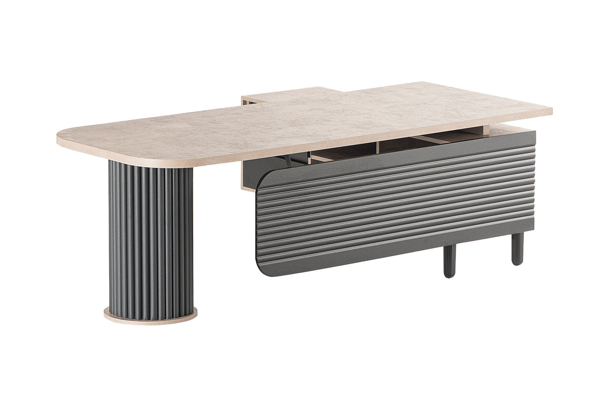 Verge Modern Yönetici Masası, silindir ayak tasarımı ve modern çizgileri ile yönetici ofislerinde estetik ve güçlü bir duruş sunar. Dikkat çekici formu sayesinde çalışma alanlarına karakter kazandıran şık bir masa çözümüdür.