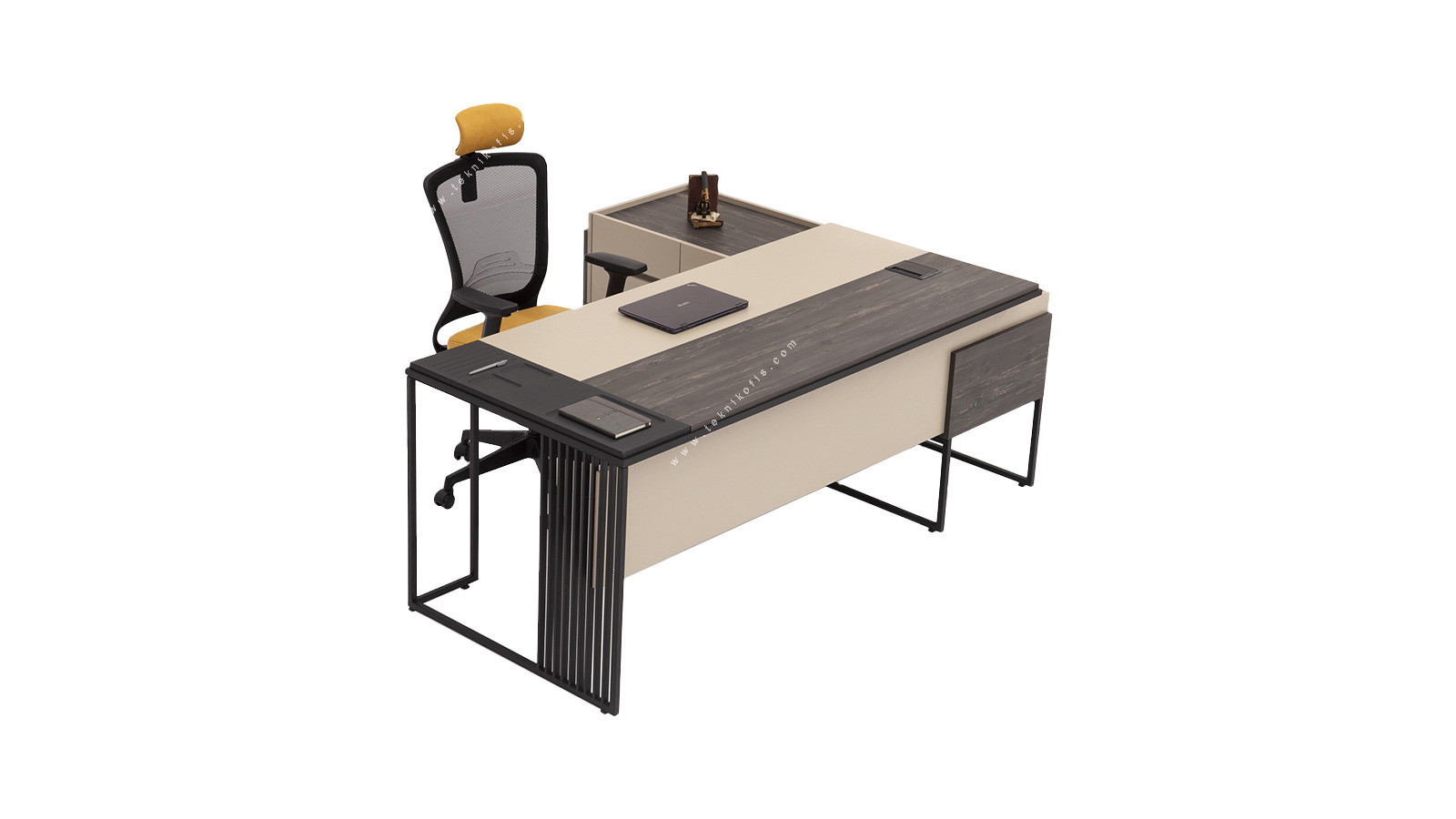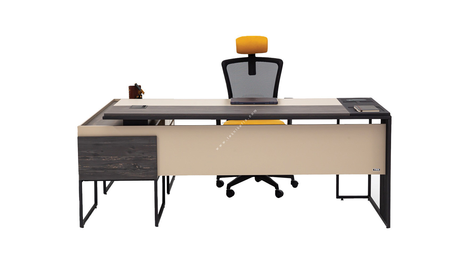 Vikos Yönetici Çalışma Masası, yöneticilerin dinamik çalışma temposuna uyum sağlayacak şekilde tasarlanmıştır. Geniş ve düzenli çalışma alanı sunan masanın, entegre depolama birimleri sayesinde önemli belgelerinizi ve ofis gereçlerinizi elinizin altında tutabilirsiniz. Modern çizgileri, zarif detayları ve seçkin renk uyumu, ofisinize sofistike ve profesyonel bir atmosfer kazandırır. Vikos ofis masası, sadece bir çalışma alanı değil, aynı zamanda ofisinizin merkezinde prestijinizi yansıtan bir tasarım öğesidir.