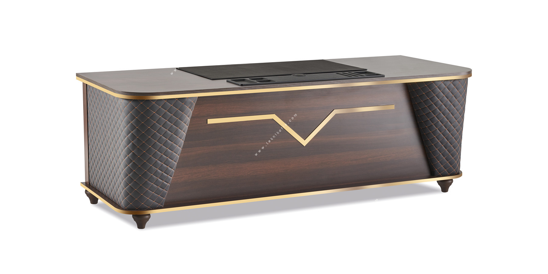 Viveda Metal Detaylı Yönetici Masası, melamin yüzeyi, metal detayları ve deri kaplamasıyla modern yönetici ofislerine prestijli bir çözüm sunar. Geniş çalışma alanı, bilgisayar, evrak ve aksesuarlar için ferah ve organize bir kullanım sağlar. Kurumsal ofislerde hem estetik hem fonksiyonel bir makam masası arayanlar için tasarlanmıştır.