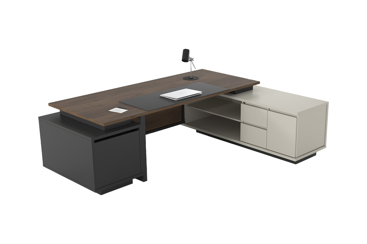 Zayra Etajerli Yönetici Çalışma Masası, modern ofislerin depolama ve estetik beklentilerini karşılamak üzere tasarlanmıştır. Etajerli masa, geniş çalışma yüzeyi ve entegre edilmiş bir etajerden oluşmaktadır. Etajerde bulunan kapalı ve açık bölmeler, evrakların ve ofis malzemelerinin düzenli bir şekilde saklanmasına olanak tanır. Bu sayede, çalışma alanınızda hem düzeni sağlar hem de şık bir görünüm sunar.