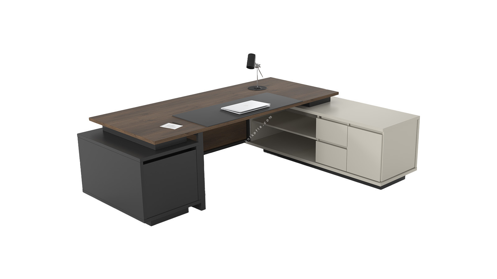 Zayra Etajerli Yönetici Masası, modern ofislerin depolama ve estetik beklentilerini karşılamak üzere tasarlanmıştır. Modern masa, geniş çalışma yüzeyi ve sağ tarafında entegre edilmiş bir etajerden oluşmaktadır. Bu etajerli ofis masası, günlük ofis kullanımının getirdiği yoğunluğa dayanacak şekilde yüksek kaliteli malzemelerden üretilmiştir. Geniş çalışma yüzeyi, dizüstü bilgisayar, belge ve diğer ofis gereçleri için yeterli alan sunar.