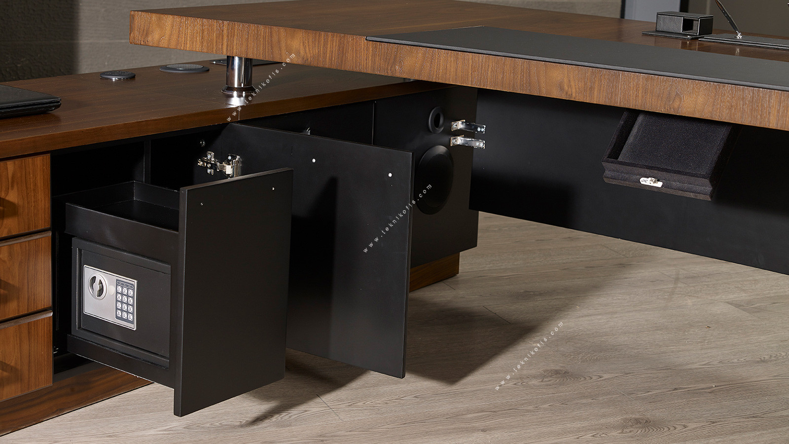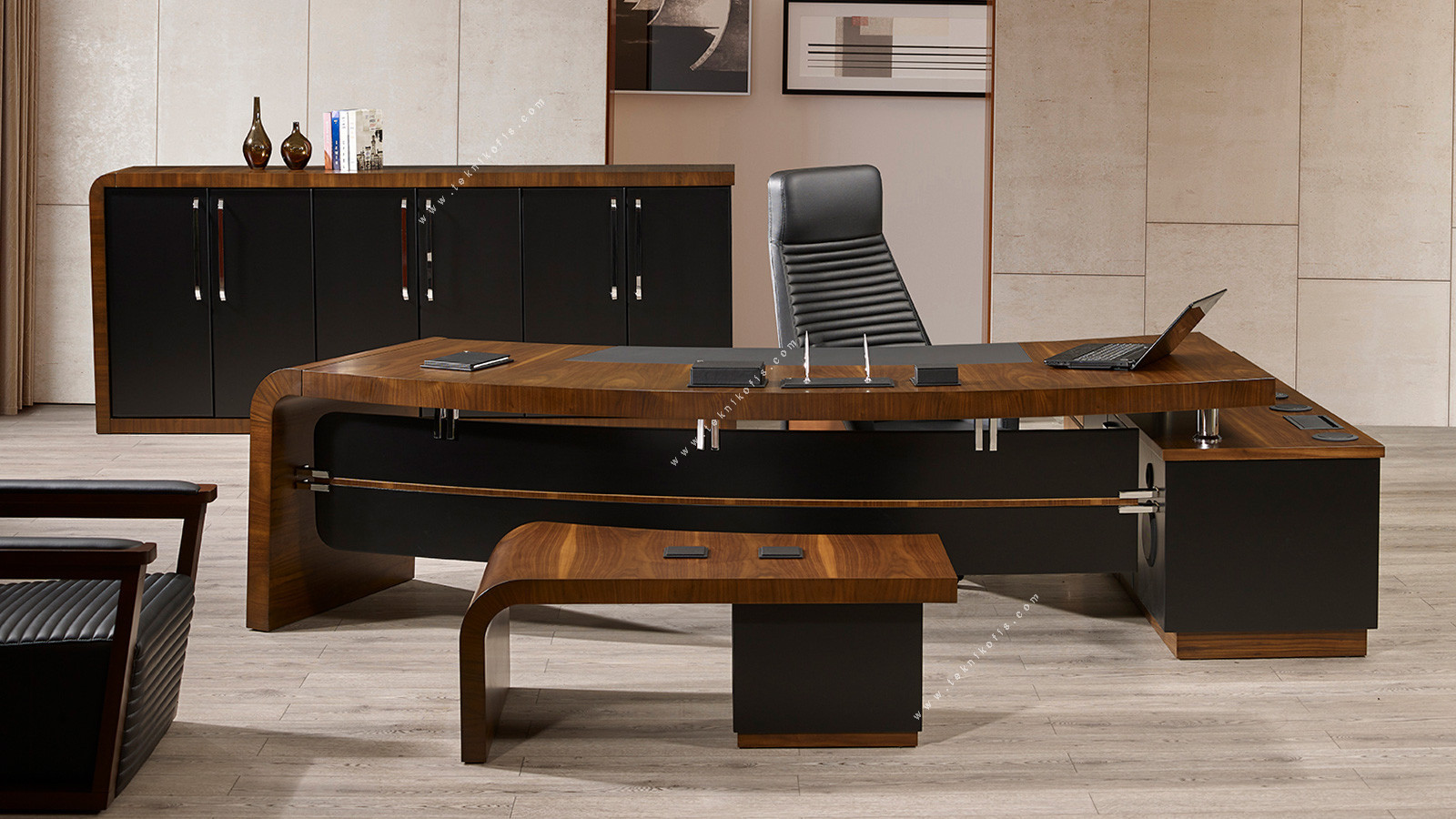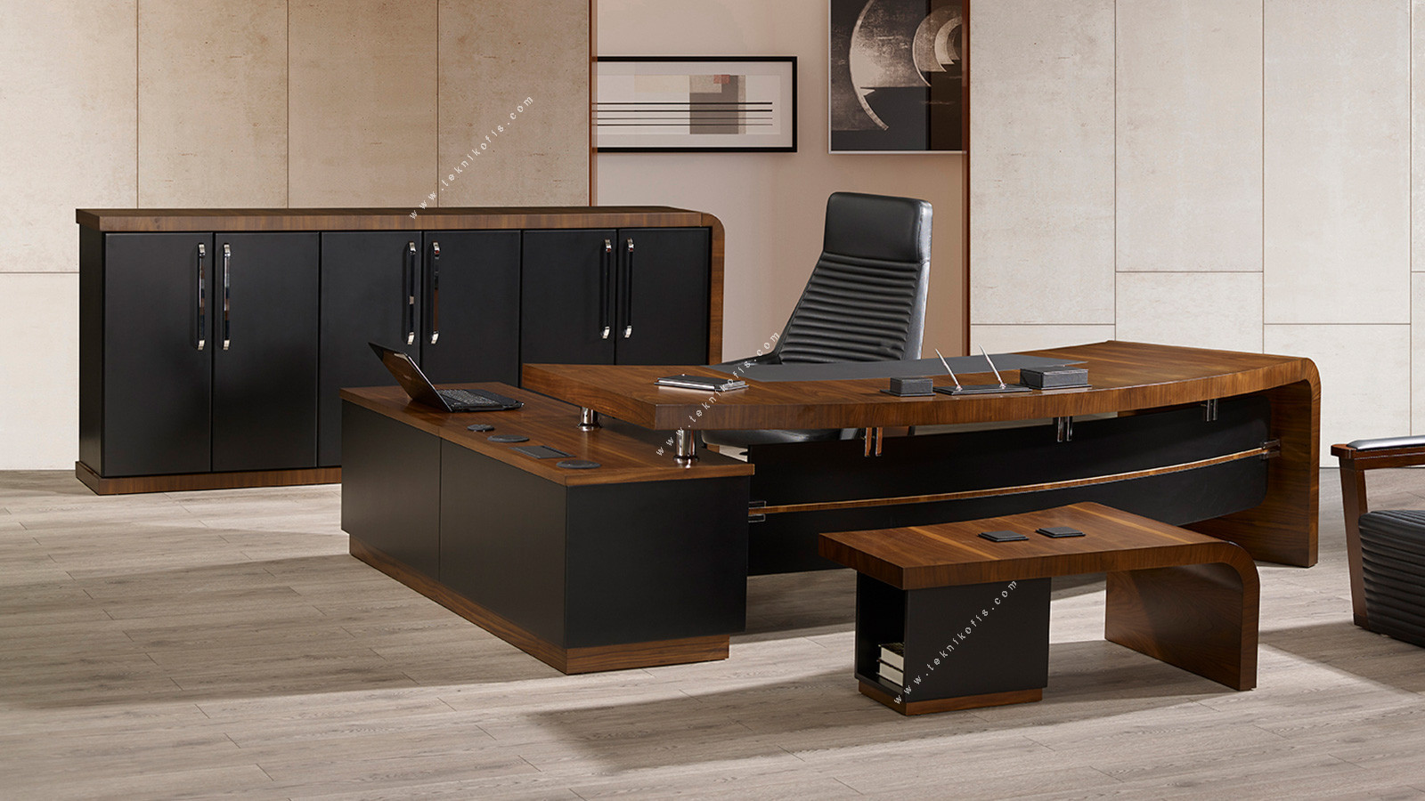 Modern makam takımı net hatları ve minimalist yapısı, modern ofis mimarisine mükemmel bir uyum sağlar. Geniş masası, geniş depolama ünitesi ve zarif sehpasıyla bir bütünlük oluşturan bu takım, ofisinizde görsel bir denge ve düzen sunar. Makam takımı, estetik detaylardaki özeniyle mekanınızda ilham verici ve prestijli bir çalışma ortamı yaratır, kişisel zevkinizi ve profesyonelliğinizi yansıtır.