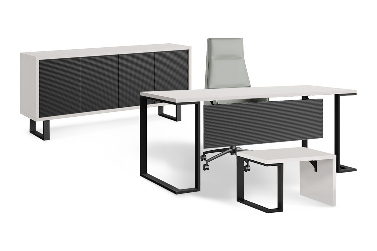 Bondo Modern Yönetici Takımı, yönetici ofisleri için minimalist estetiği ve fonksiyonelliği birleştiren bir settir. Masanın tasarımı, kalın, metal ayaklarla desteklenir, bu ayaklar masaya modern, endüstriyel bir hava katar. Masanın ön yüzünde, tasarıma derinlik katan, yatay çizgili bir panel detayı bulunur. Bu yönetici odası takımı, keskin hatları, sağlam metal iskeleti ve uyumlu depolama çözümleriyle profesyonel bir çalışma ortamı sunar.