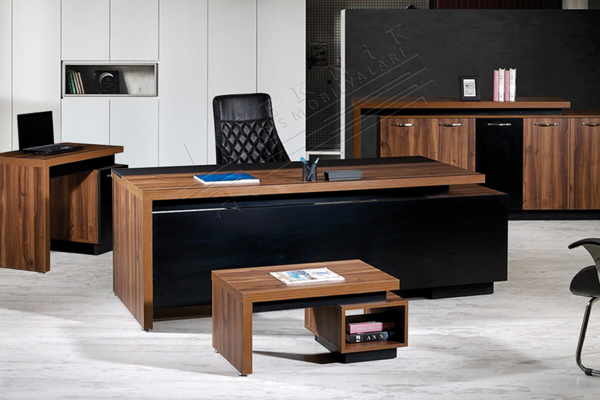 Buena Yönetici Mobilya Takımı, modern ofislerin depolama ve estetik ihtiyaçlarını karşılamak üzere tasarlanmış kapsamlı bir mobilya setidir. Takım, geniş bir yönetici masası, etajer, dolap ve uyumlu bir sehpadan oluşmaktadır. Bu yönetici odası mobilya takımı, ofisinizde görsel bir bütünlük ve profesyonel bir atmosfer yaratır.