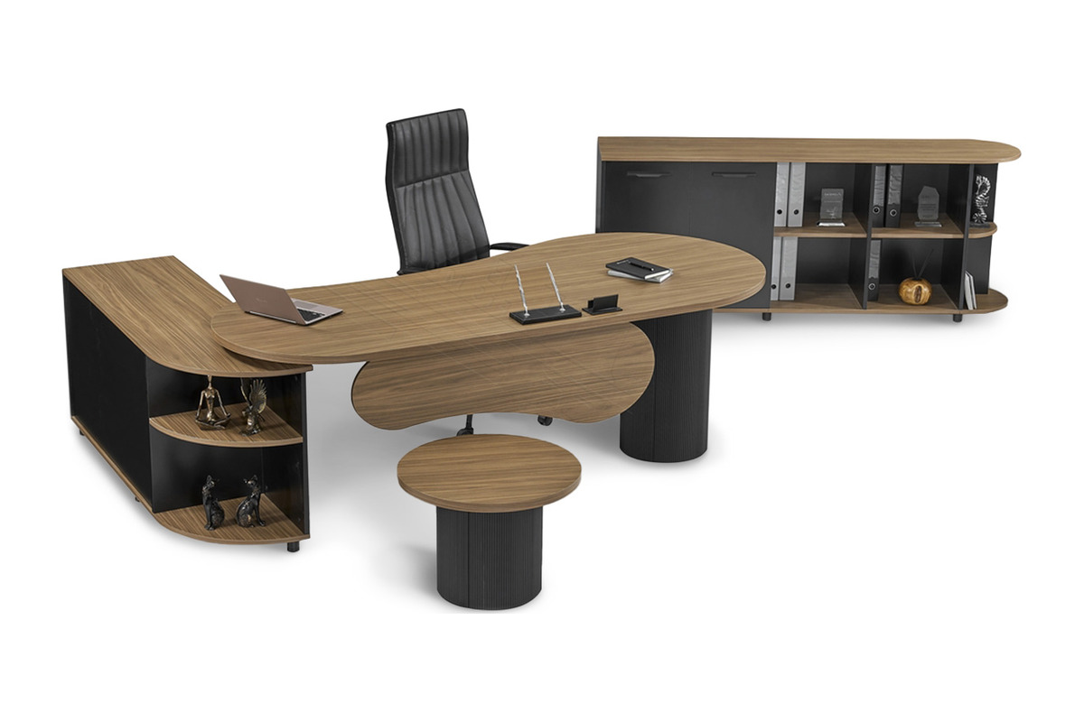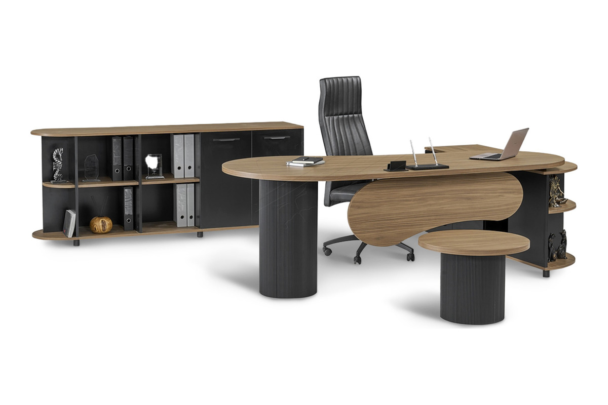 Cadia Yönetici Ofis Takımı, etajerli masa, dolap ve sehpadan oluşan kavisli hatlara sahip modern bir yönetici setidir. Masa ve sehpanın silindir ayak tasarımı takıma özgün bir karakter kazandırırken, masa ve dolapta bulunan açık raf detayları hem estetik hem fonksiyonel kullanım sunar. Yönetici ofislerinde şık, akıcı ve düzenli bir çalışma alanı oluşturur.