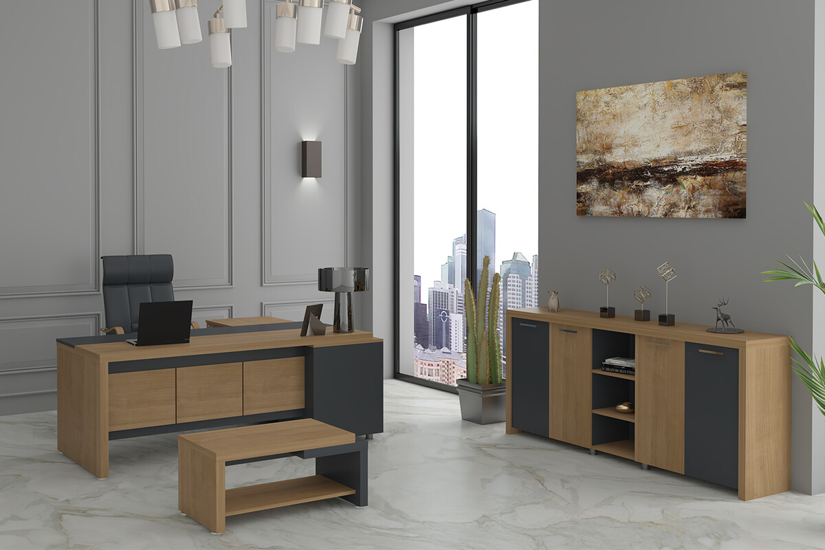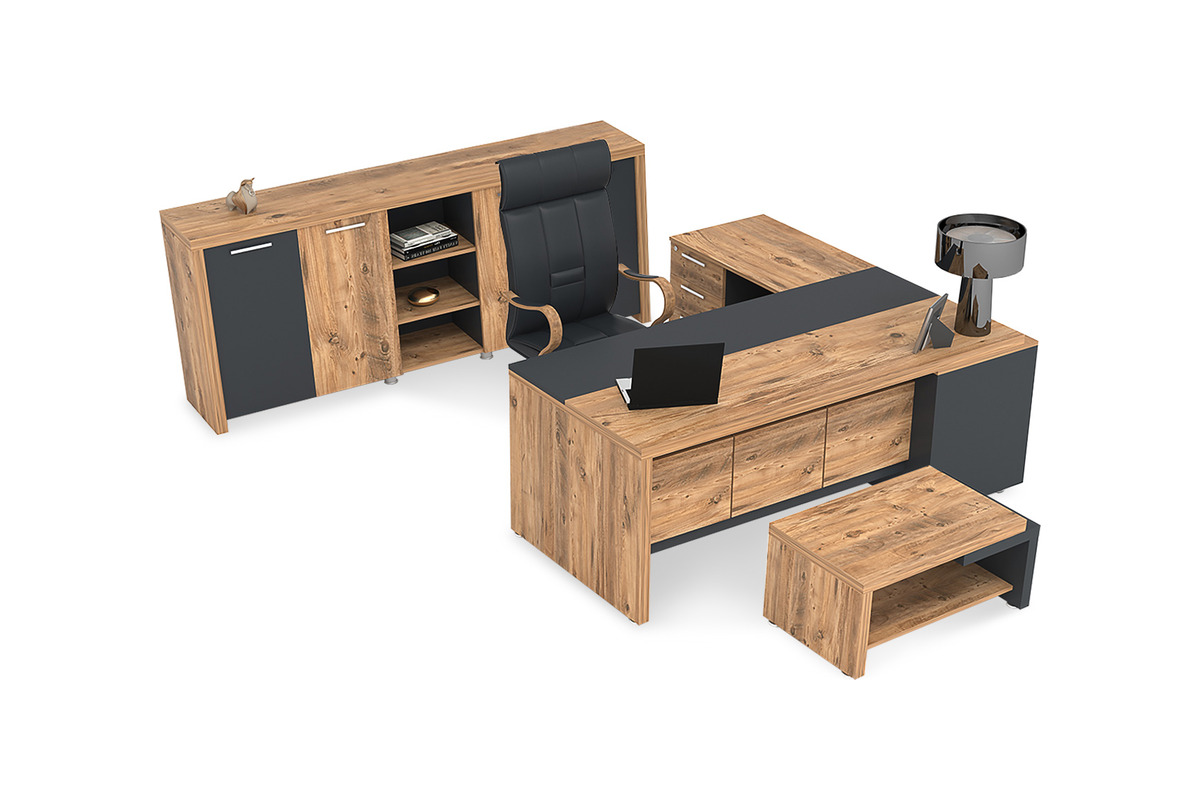 Connect Etajerli Yönetici Takımı, çağdaş yönetici ofisleri için özel olarak tasarlanmış, estetik ve işlevselliği bir araya getiren kapsamlı bir mobilya setidir. Bu yönetici odası mobilya takımı, ofisinizde modern, düzenli ve verimli bir çalışma atmosferi yaratmak üzere titizlikle üretilmiştir. Takımın ana unsurları geniş bir yönetici masası, entegre etajeri, bol depolama alanı sunan bir dolap ve şık bir sehpadan oluşur.