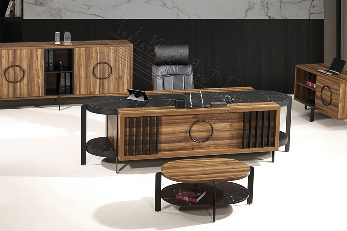 Corbea Metal Ayaklı Yönetici Takımı, modern tasarımı ve etkileyici detaylarıyla ofisinize çağdaş bir prestij ve özgün bir kimlik kazandırır. Masa önündeki dikey panel detayları ile yuvarlak metal kulplar, tasarıma sanatsal ve özgün bir dokunuş ekler. Oval formdaki masa üstü ve takımın genelindeki yuvarlak hatlar, ofisinize yumuşaklık ve modern bir dinamizm getirir. Misafirleriniz üzerinde unutulmaz bir izlenim bırakmanızı sağlayarak, ofisinizde ilham verici ve prestijli bir çalışma ortamı yaratır, mekanınıza karakter ve derinlik katar.
