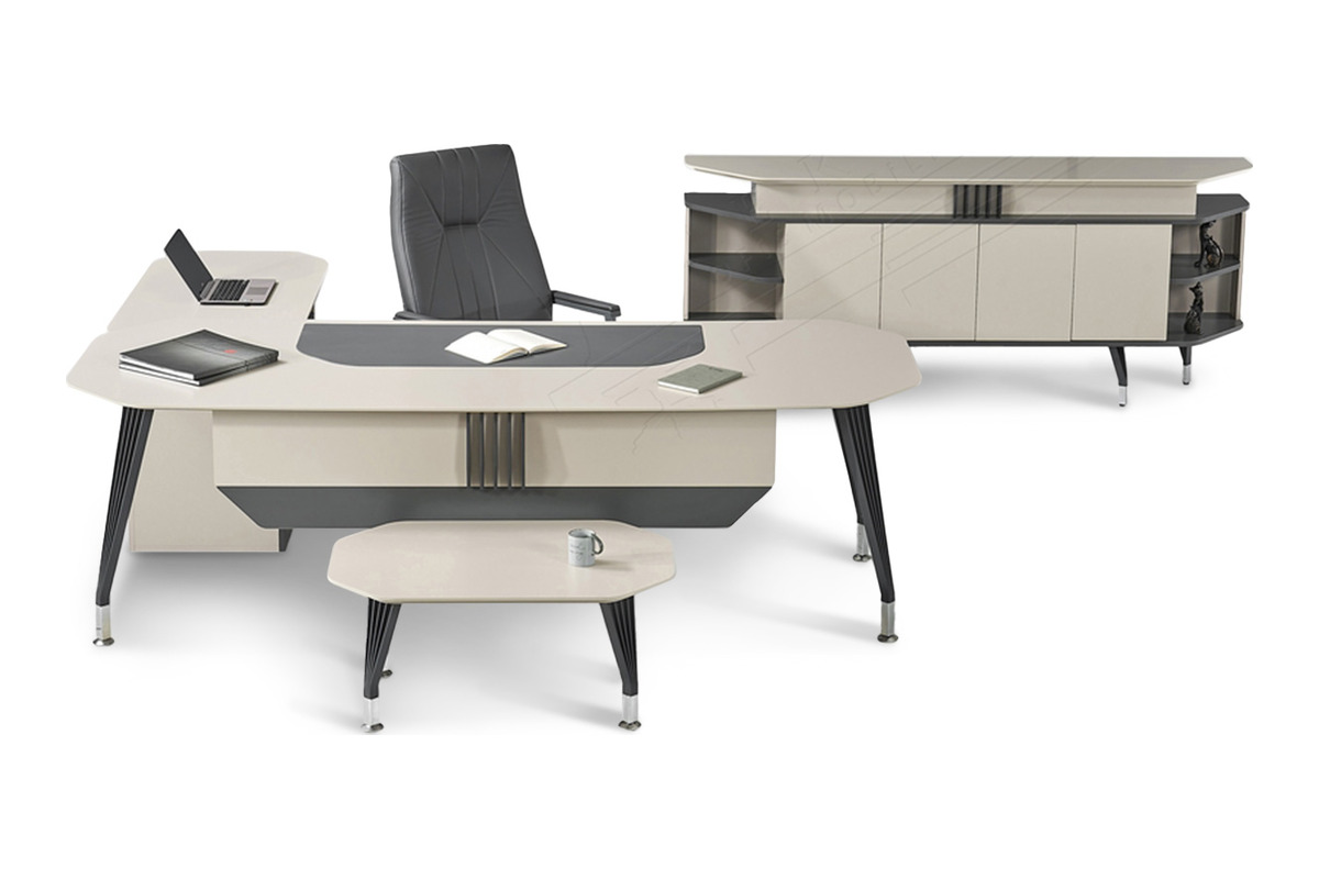 Ofisinizde modern bir vizyon ve prestijli bir duruş sergilemek istiyorsanız, Corlas Yönetici Takımı tam size göre. Etajerli masa tasarımı, geniş çalışma alanı ile operasyonel ihtiyaçlarınızı birleştirirken, zarif metal ayak detayları takıma çağdaş bir estetik kazandırır. Set içerisinde yer alan uyumlu dolap ve sehpa, yönetim ofisinizin mimari bütünlüğünü tamamlayarak hem estetik hem de düzenli bir çalışma ortamı sunar.