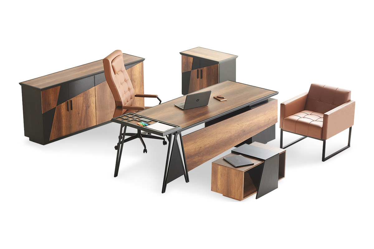 Cortege Siyah Metal Ayaklı Yönetici Takımı, modern yönetici ofisleri için özel olarak tasarlanmış, metalin sağlamlığını ahşabın sıcaklığıyla birleştiren kapsamlı bir mobilya setidir. Bu takım, ofisinizde dinamik, düzenli ve verimli bir çalışma atmosferi yaratmak üzere titizlikle üretilmiştir. Takımın genelinde kullanılan geometrik desenler, tasarıma özgün ve dikkat çekici bir karakter verir. Bu yönetici takımı, işlevselliği, estetiği ve profesyonel görünümüyle yönetici ofisleri için ideal bir çözümdür.
