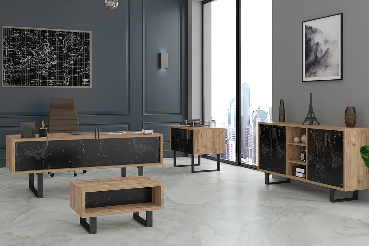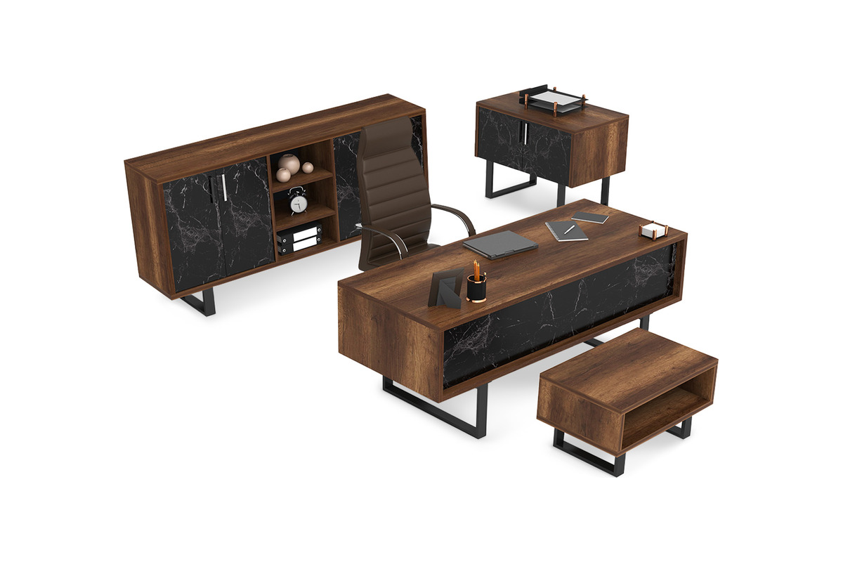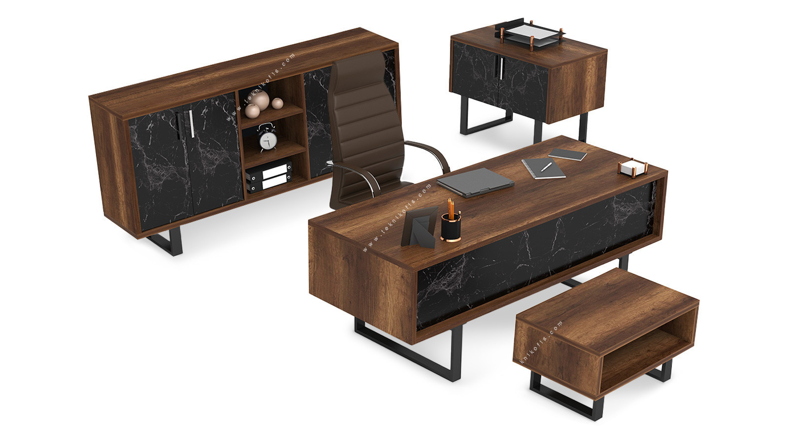Defround Yönetici Takımı, modern ve lüks tasarımıyla ofisinize prestijli ve çağdaş bir kimlik kazandırır. Takımın net çizgileri ve minimalist yapısı, modern ofis mimarisine mükemmel bir uyum sağlar. Mermer desenli yüzeyler, takıma lüks bir dokunuş katarken, güçlü ve sağlam duruşu profesyonelliğinizi yansıtır. Misafirleriniz üzerinde kalıcı bir ilk izlenim bırakmanızı sağlayan ofis takımı, ofisinizde ilham verici ve prestijli bir çalışma ortamı yaratır.