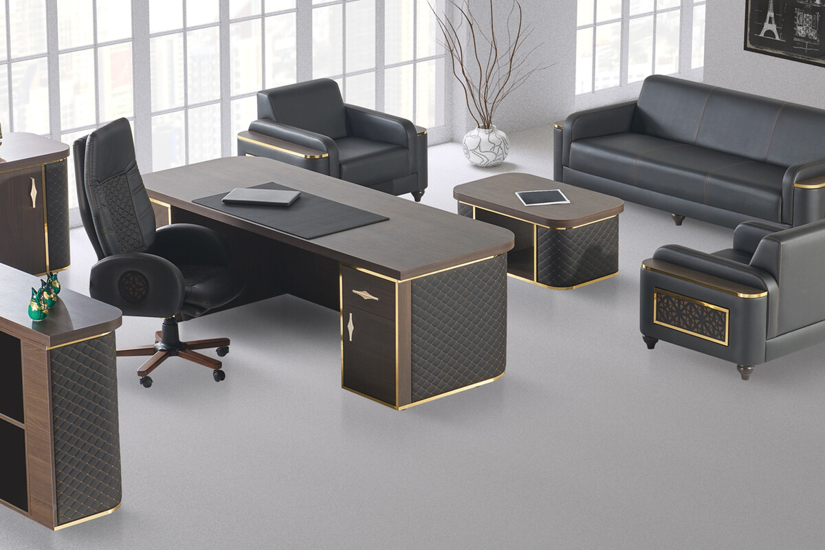 Yüksek profilli makam takımı net hatları ve minimalist yapısı, modern ofis mimarisine mükemmel bir uyum sağlar. Geniş masası, işlevsel dolabı, pratik etajeri ve zarif sehpasıyla bir bütünlük oluşturan bu takım, ofisinizde görsel bir denge ve düzen sunar. Makam takımı, estetik detaylardaki özeniyle mekanınızda ilham verici ve prestijli bir çalışma ortamı yaratır, kişisel zevkinizi ve profesyonelliğinizi yansıtır.