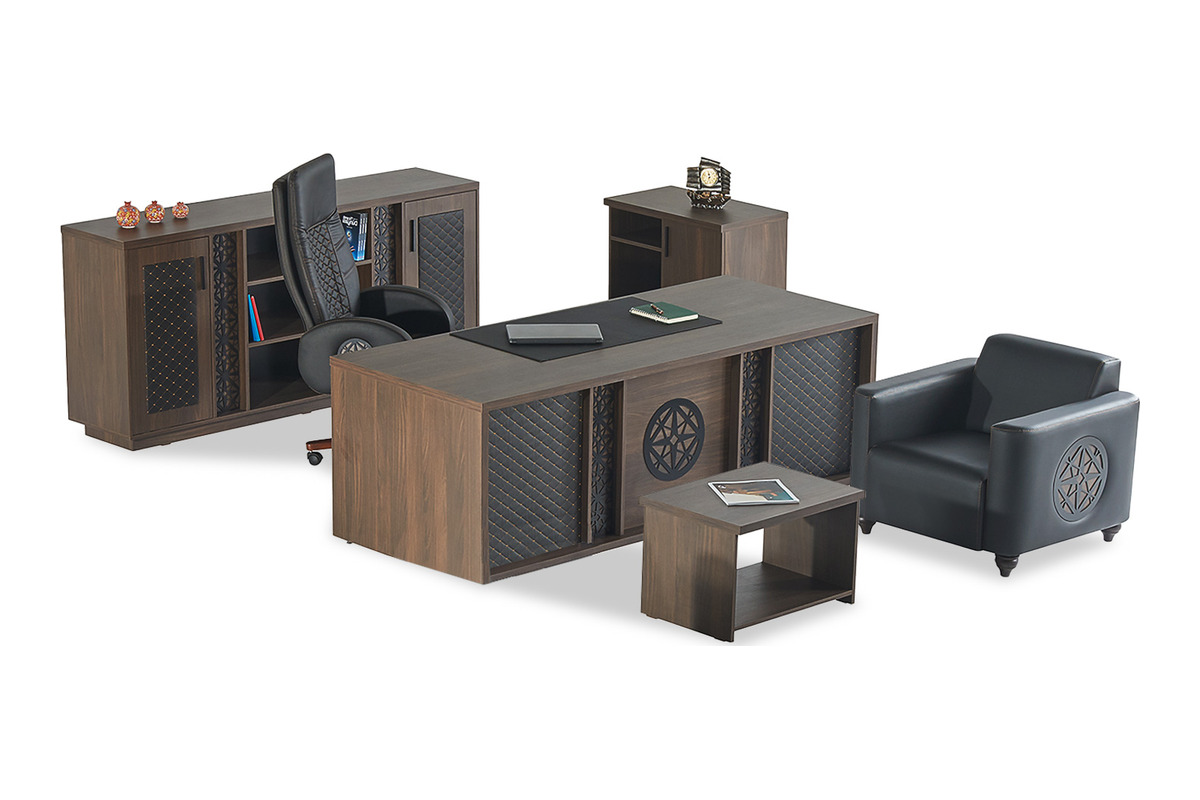 Takımın odak noktası, geniş ve kompozisyonel olarak güçlü duruşuyla dikkat çeken yönetici masasıdır. Masanın ön yüzeyi, koyu melamin zemini üzerinde yer alan, geometrik formları harmanlayan zarif bir motifle süslenmiştir. Bu motif, takımın genel estetiğine derinlik ve sanatsal bir karakter katar. Depolama çözümü olarak tasarlanan dolap ünitesi de aynı koyu melamin tonlarında ve masayla uyumlu motifli kapak detaylarıyla mekana bütünlük katar. Bu ünite, evraklar ve ofis malzemeleri için düzenli bir depolama alanı sunarken, motifli kapaklarıyla görsel çekiciliğini korur. Takımı tamamlayan sehpa ve etajer, masanın genel tasarım dilini yansıtan minimalist ve zarif parçalardır.