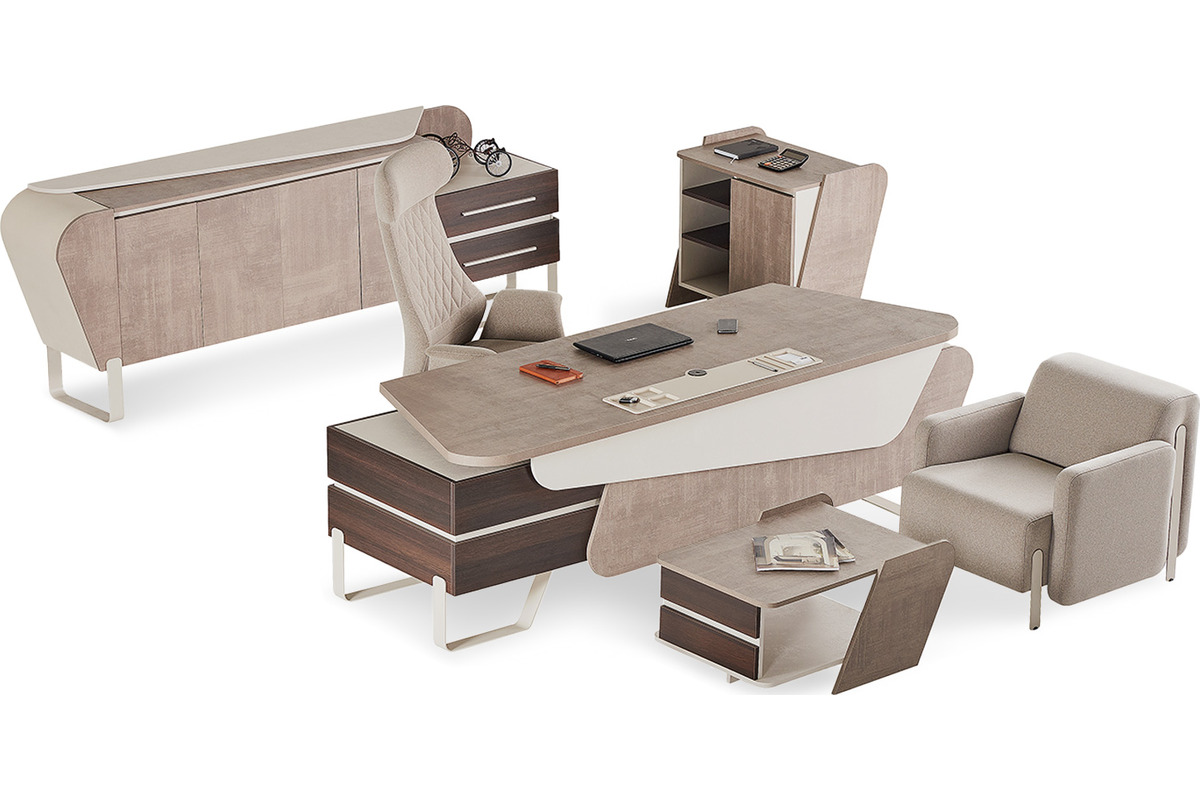 Felmorza Modern Yönetici Takımı, güçlü tasarımı ve yüksek işlevselliğiyle modern ofis anlayışını yeniden tanımlıyor. Geniş asimetrik masa formu, hem estetik hem de verimli bir çalışma alanı sunar. Takımı tamamlayan şık dolap ve etajer, depolama alanınızı genişletirken mekanda bütünlük yaratır. Estetikle fonksiyonelliği mükemmel biçimde birleştiren Felmorza, yöneticilerin vizyonunu yansıtan güçlü bir imza niteliğindedir.