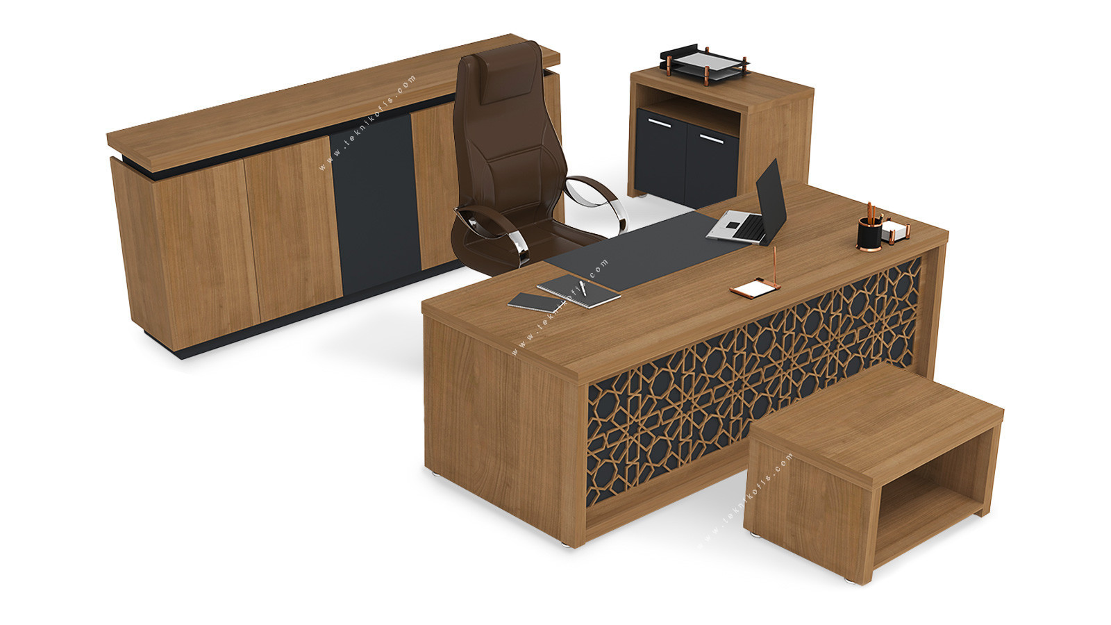 Garen Tasarım Makam Takımı, modern yönetici ofisleri için özel olarak dizayn edilmiş, estetiği ve işlevselliği bir arada sunan kapsamlı bir mobilya setidir. Bu takım, çalışma alanınıza sanatsal bir dokunuş katarken, profesyonel bir atmosferin oluşmasına katkı sağlar. Takımın ana unsurları arasında geniş bir makam masası, zarif bir dolap, işlevsel bir etajer, uyumlu bir keson ve tamamlayıcı bir sehpa bulunur. Masanın ahşap yüzeyi, ön panelindeki göz alıcı geometrik desenli detaylarla dikkat çeker. Yüksek kaliteli malzemelerden üretilen makam ofisi takımı, uzun ömürlü kullanım vadederek ofisinizin prestijini artırır.