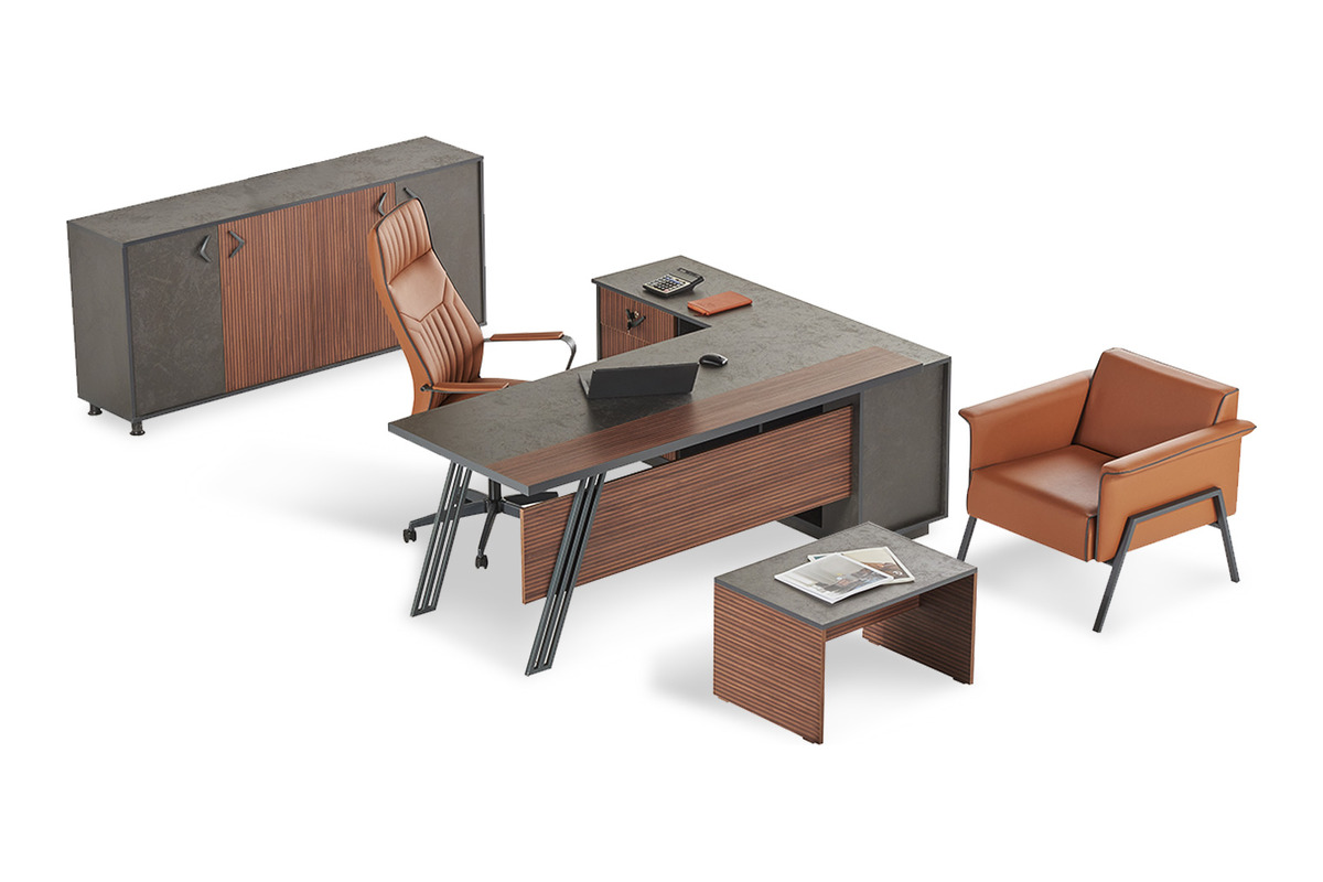 Takımın ana parçaları, geniş ve estetik bir yönetici masası, işlevsel bir depolama dolabı ve zarif bir sehpadan oluşur. Tüm parçalarda modern bir estetik sunan tonlar ve detaylar kullanılmıştır. Yüksek kaliteli malzemelerden üretilen ofis mobilyası takımı, dayanıklı yapısıyla uzun ömürlü bir kullanım vaat eder. Modern ve şık çizgileri, her türlü ofis dekorasyonuyla mükemmel bir uyum sağlayarak ortamın profesyonel imajını güçlendirir.