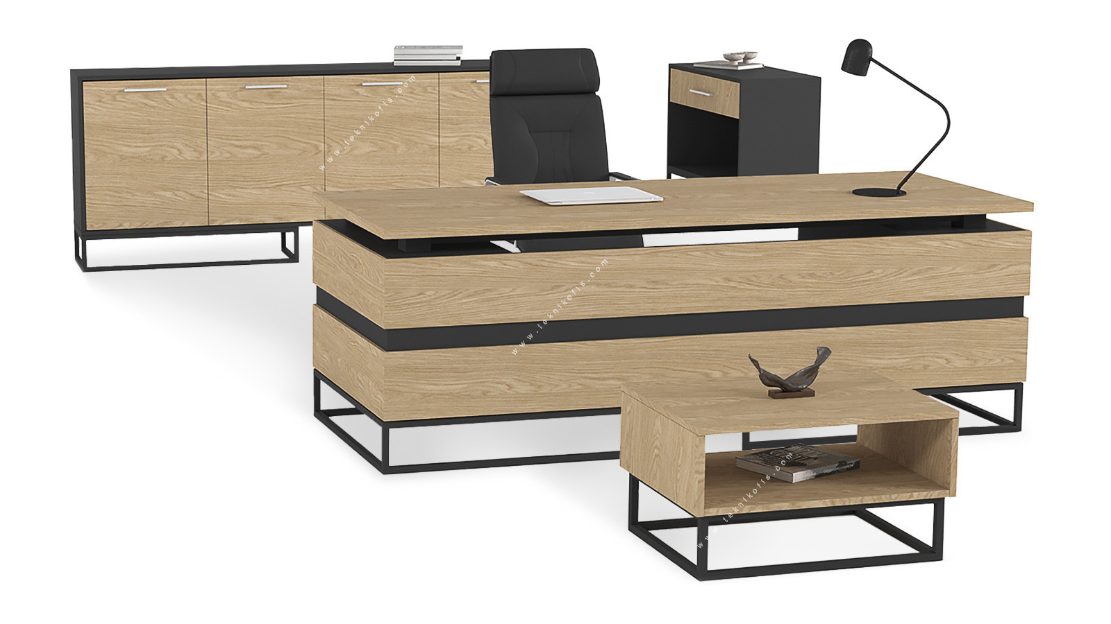 Ofisinizde şıklık ve verimliliği bir araya getiren Groly Klasik Makam Takımı ile tanışın. Takım, geniş ve kullanışlı bir çalışma masası, zarif bir etajer, şık bir dolap ve eşleşen bir sehpadan oluşur. Masa, geniş çalışma alanı sunarken, dolap ve etajer ekstra depolama kapasitesiyle ofis düzeninizi destekler. Bu modern ofis takımı, yöneticiler için hem prestijli hem de fonksiyonel bir çalışma ortamı yaratır.