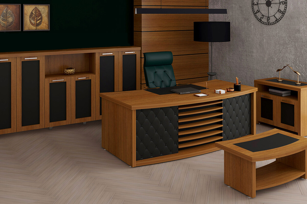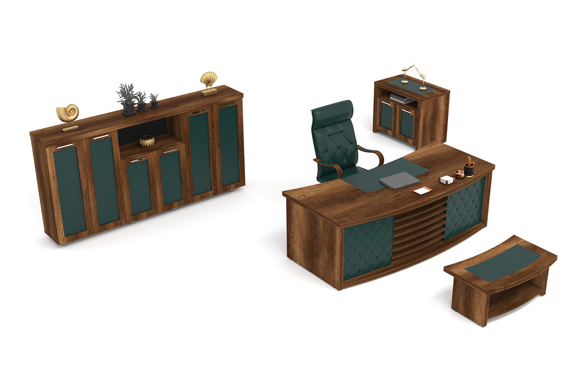 Yuvarlak hatlı ve zarif çizgileriyle mobilya takımı, ofisinizin genel atmosferini yükselterek klas ve etkileyici bir görünüm sunar. Sadece bir çalışma alanı olmanın ötesinde, kişisel zevkinizi ve profesyonelliğinizi yansıtan güçlü bir semboldür. Misafirleriniz üzerinde kalıcı bir izlenim bırakmanızı sağlayarak, ofisinizde ilham verici ve prestijli bir çalışma ortamı yaratır. Bu özel tasarım, mekanınıza karakter ve zarafet katarak ofisinizin havasını tamamen değiştirir.