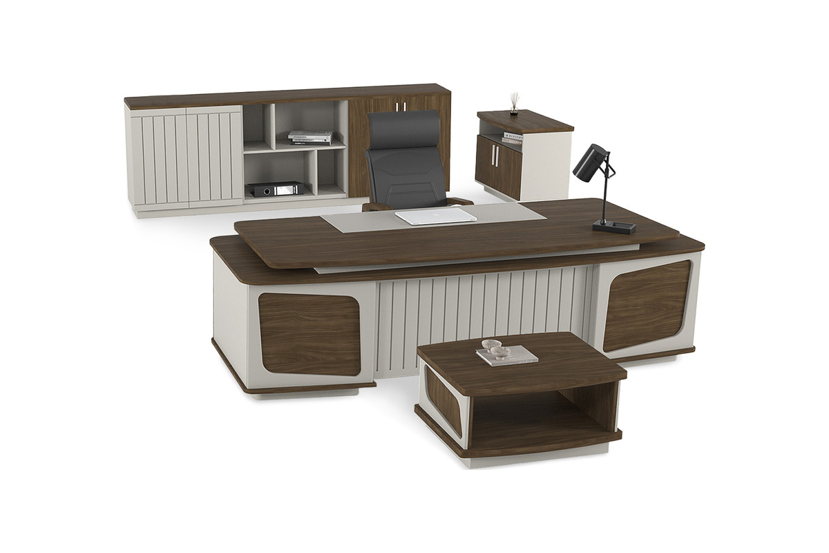 Korin Yönetici Masası Takımı, yönetici ofislerinin hem estetik hem de pratik ihtiyaçlarını karşılamak üzere tasarlanmış kapsamlı bir mobilya çözümüdür. Takım, geniş ve yumuşak hatlara sahip bir ofis masası, ofis etajeri, uyumlu bir ofis dolabı ve sehpadan oluşmaktadır. Etajerde ve dolapta bulunan geniş depolama alanları, evrakların ve ofis malzemelerinin düzenli bir şekilde saklanmasına olanak tanır. Bu modern yönetici takımı, günlük ofis kullanımının getirdiği yoğunluğa dayanacak şekilde yüksek kaliteli ahşap malzemelerden üretilmiştir.