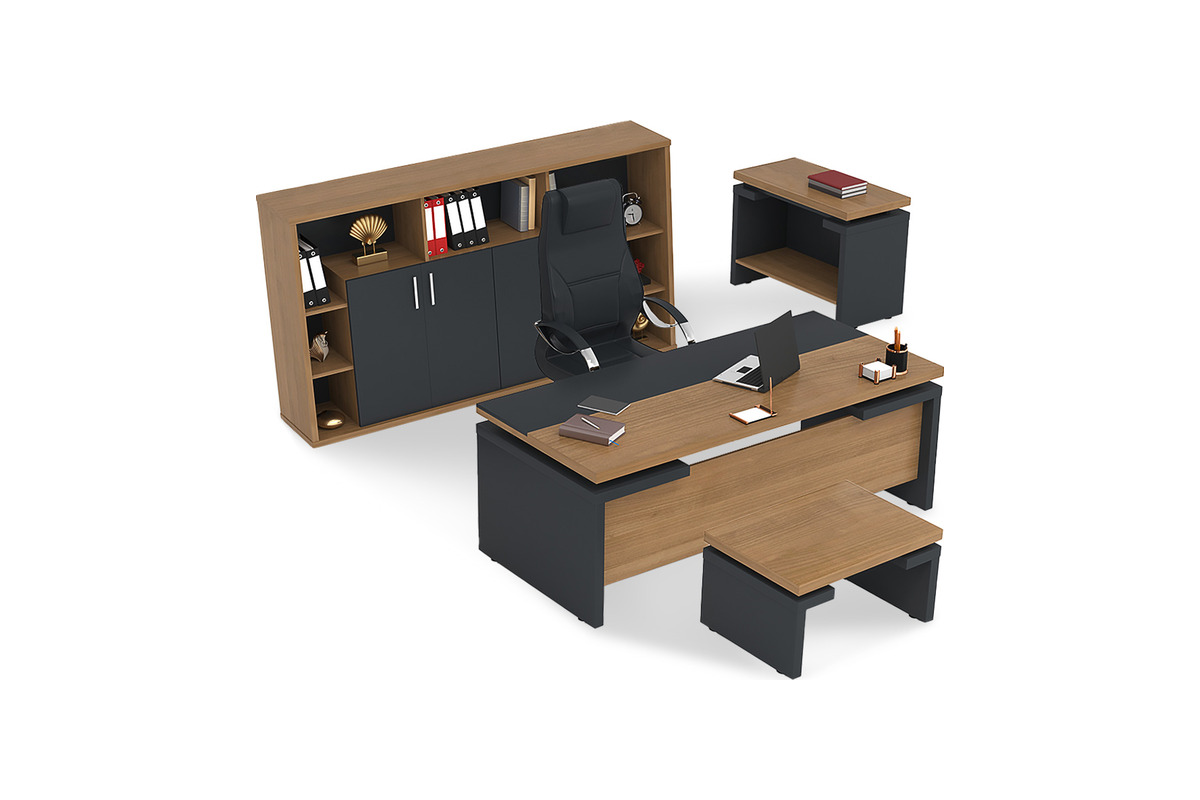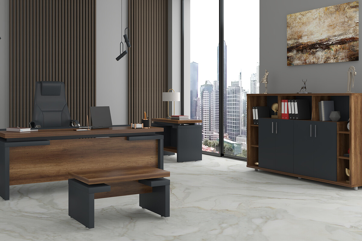 Laressa Makam Takımı, modern yönetici ofisleri için tasarlanmış, çağdaş çizgileri ve sofistike renk uyumunu bir araya getiren kapsamlı bir mobilya setidir. Bu ofis masası takımı, ofisinizde prestijli, düzenli ve verimli bir çalışma atmosferi yaratmak üzere titizlikle üretilmiştir. Takımın ana parçaları, geniş ve estetik bir makam masası, bol depolama alanı sunan bir dolap, işlevesel bir etajer, uyumlu bir keson ve şık bir sehpadan oluşur.