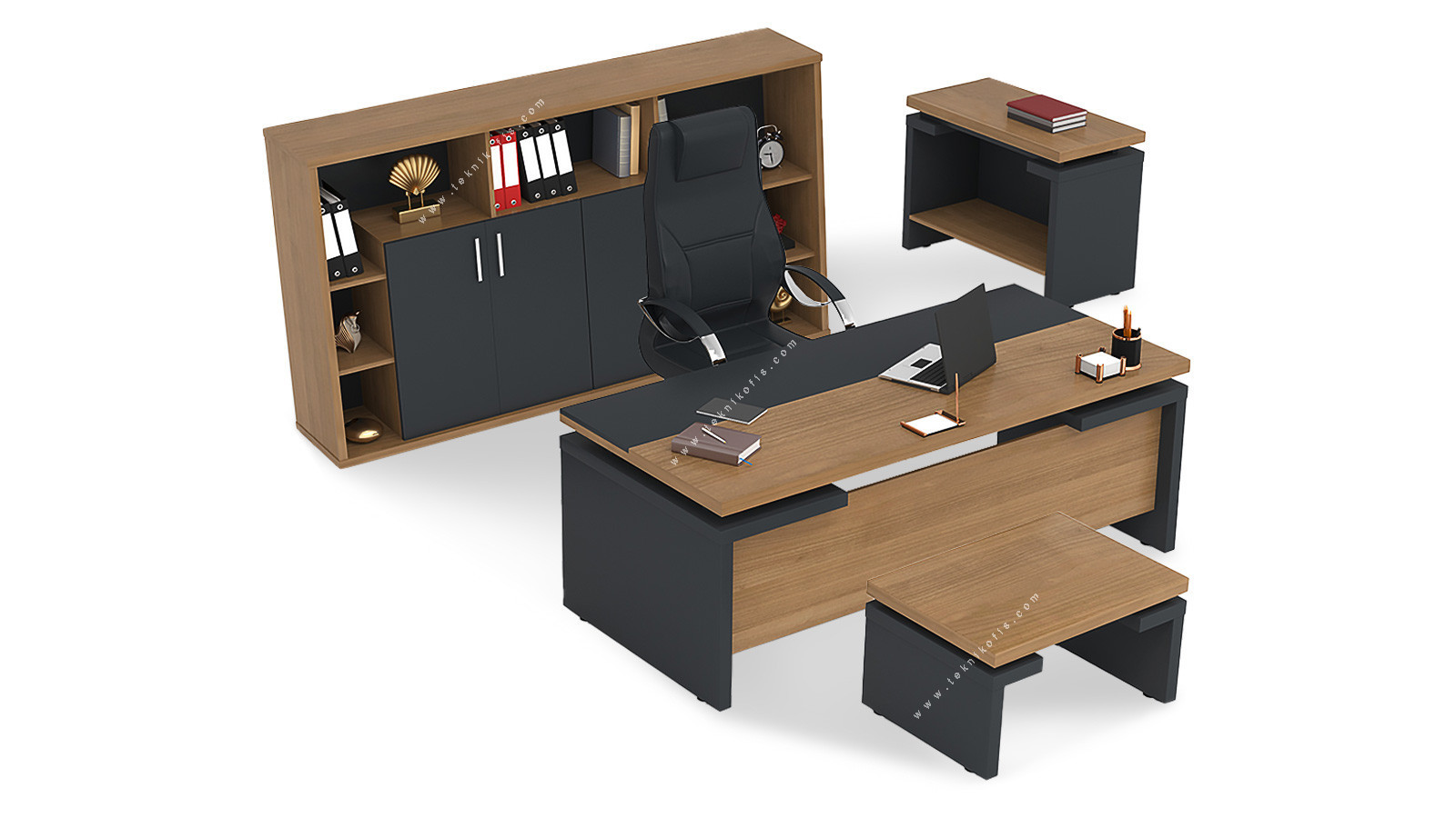Laressa Makam Takımı, modern yönetici ofisleri için tasarlanmış, çağdaş çizgileri ve sofistike renk uyumunu bir araya getiren kapsamlı bir mobilya setidir. Bu yönetici odası masa takımı, ofisinizde prestijli, düzenli ve verimli bir çalışma atmosferi yaratmak üzere titizlikle üretilmiştir.