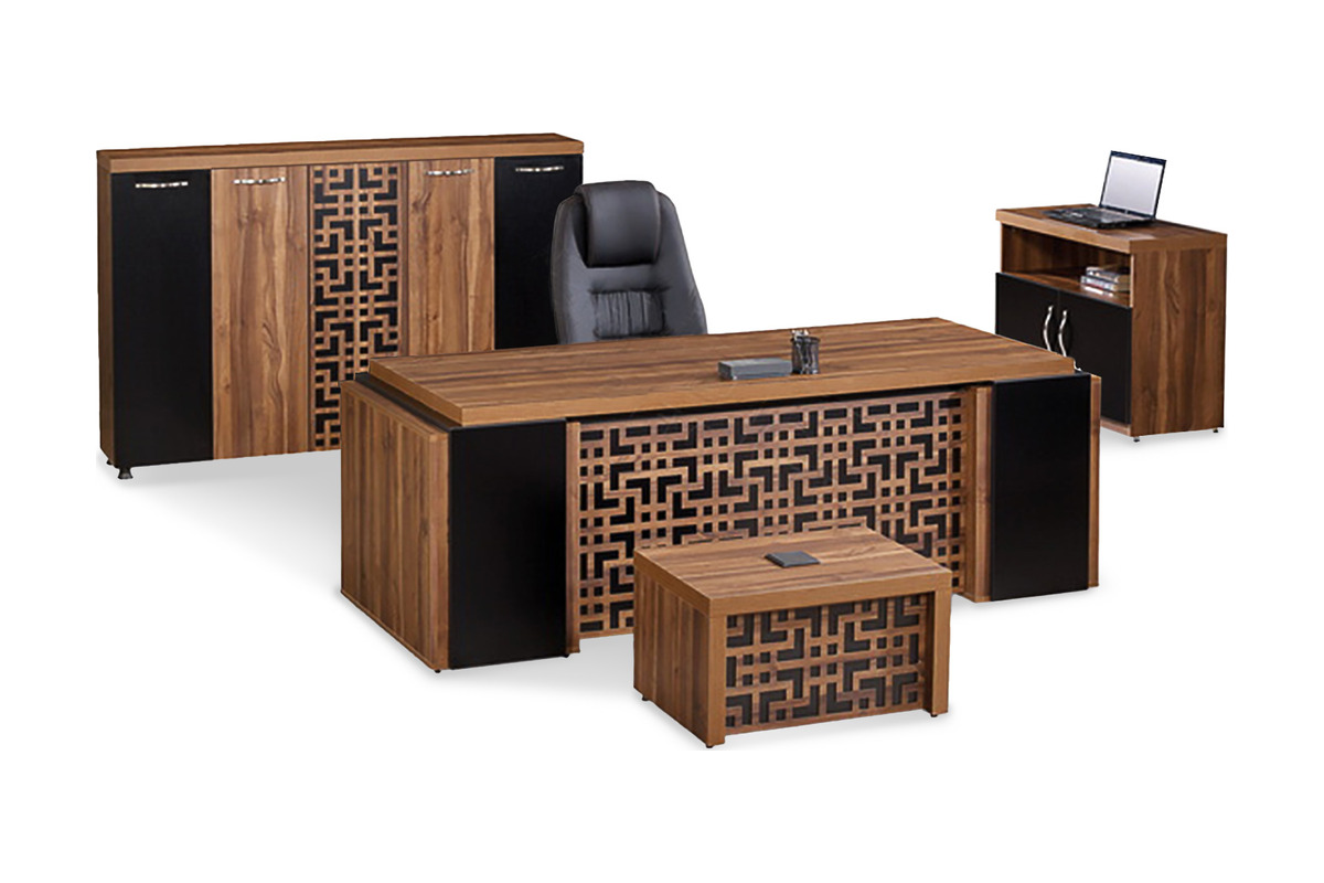 Takımın ana parçaları, geniş ve şık bir yönetici masası, bol depolama alanı sunan bir dolap, pratik bir etajer ve şık bir sehpadan oluşur. Özellikle takımın genelinde bulunan geometrik desenli ahşap işlemeler, takıma özgün ve sanatsal bir karakter verir. Klasik masa takımı, işlevselliği, estetiği ve profesyonel görünümüyle yönetici ofisleri için ideal bir çözümdür.