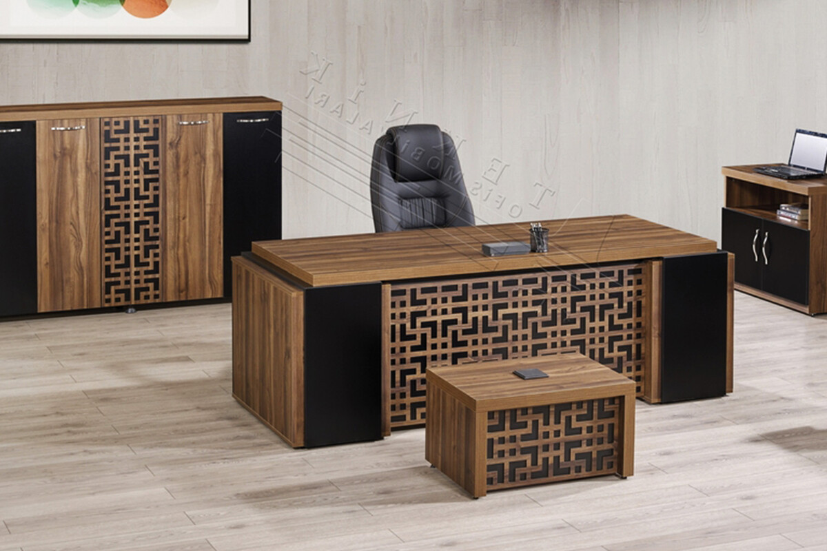 Takımın ana parçaları, geniş ve göz alıcı bir yönetici masası, bol depolama alanı sunan bir dolap, pratik bir etajer ve şık bir sehpadan oluşur. Özellikle takımın genelinde bulunan geometrik desenli ahşap işlemeler, takıma özgün ve sanatsal bir karakter verir. Bu ofis mobilyası takımı, ofisinizde sofistike, dinamik ve verimli bir çalışma atmosferi yaratmak üzere titizlikle üretilmiştir.