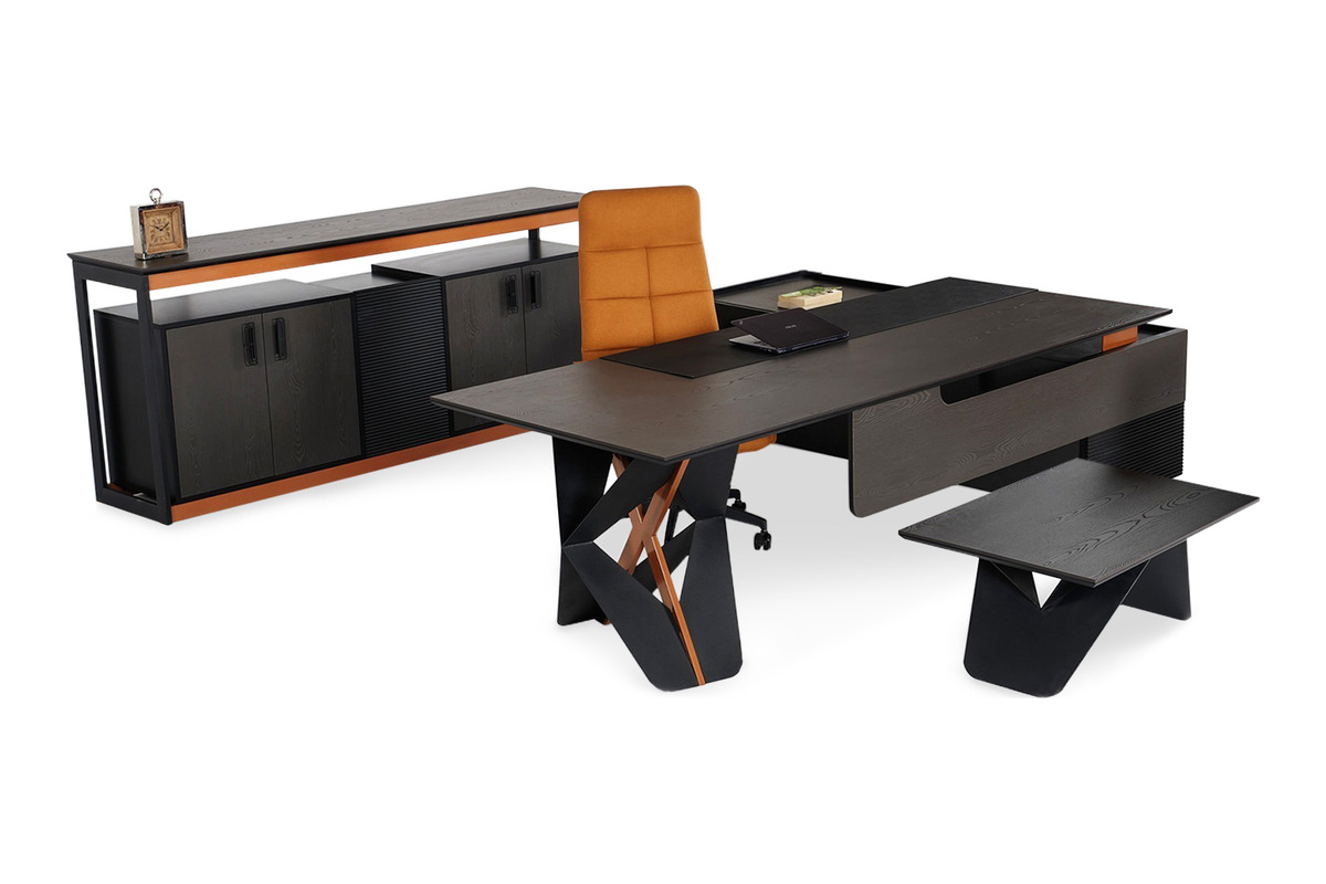 Lowy Modern Tasarım Ayaklı Makam Takımı, ofisinizdeki yönetici odasına modern bir dokunuş ve etkileyici bir çalışma ortamı kazandırmak üzere tasarlanmıştır. Takım, geniş çalışma yüzeyi sunan bir makam masası, düzenli depolama sağlayan bir dolap ve tamamlayıcı bir sehpadan oluşur. Tüm parçalarda yer alan modern tasarım ayaklar, estetik bir denge ve üstün sağlamlık sağlar. Düz hatları ve sade tasarımı, ofisinizin genel estetiğine kolayca uyum sağlar ve ferah bir atmosfer yaratır. Sağlam yapısı ve kaliteli malzemeleriyle uzun ömürlü bir kullanım vaat eden Lowy modern makam takımı, işlevselliği ve estetiği bir araya getirerek, verimli ve konforlu bir çalışma deneyimi sunar.