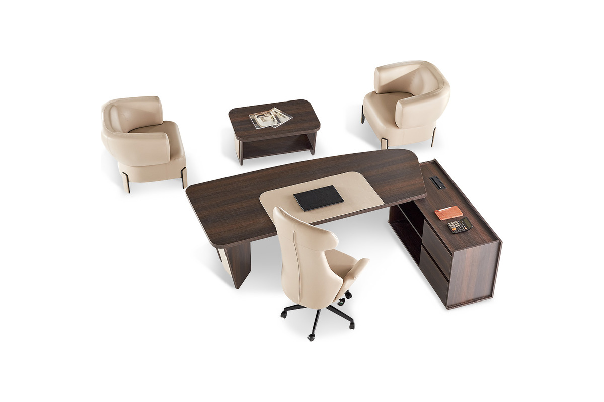 Magnario Modern Yönetici Oda Takımı, bir yönetici odasının temel ihtiyaçlarını karşılamak üzere tasarlanmış kapsamlı bir çözümdür. Takım, etajerli yönetici masası, fonksiyonel bir dolap ve şık sehpadan oluşmaktadır. Masanın geniş çalışma yüzeyi ve etajerin depolama imkanları, düzenli ve verimli bir çalışma ortamı yaratır. Bu parçalar, yöneticinin tüm ofis gereçlerini elinin altında tutmasını sağlayarak iş akışını kolaylaştırır. Ofis takımının sağlam yapısı ve kaliteli malzemeleri, uzun ömürlü ve dayanıklı bir kullanım vaat eder.