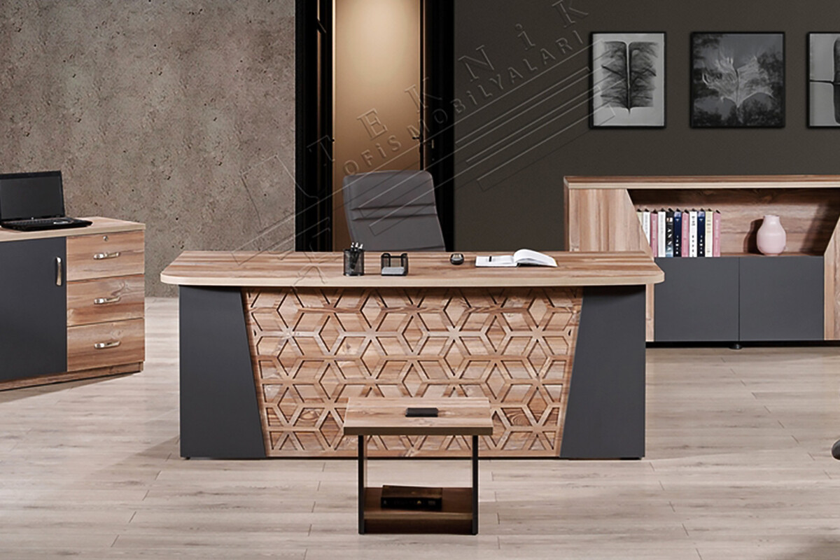 Magusa Yönetici Takımı, modern ofis ortamınıza çağdaş ve dinamik bir estetik katmak üzere özel olarak tasarlanmıştır. Özellikle masanın ön panelindeki petek desenli üç boyutlu geometrik işlemeler, mekana modern ve sanatsal bir derinlik kazandırır. Bu tasarım, ofisinizi sadece bir çalışma alanı olmaktan çıkarıp, kurum kimliğinizi yansıtan prestijli ve estetik bir alana dönüştürür.