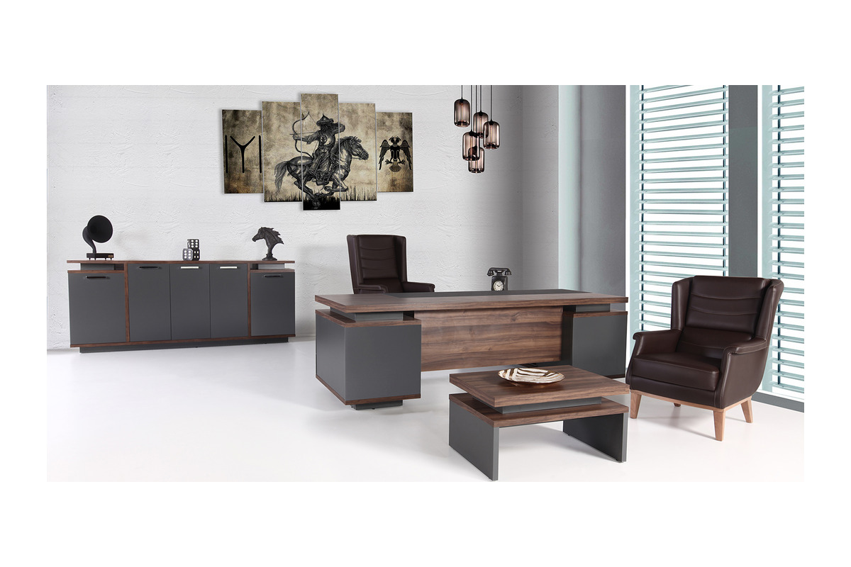 Spor ve modernizmin yeni timsali olarak kabul ettiğimiz Makron sümenli yönetici ofis takımı, hoş, sade ve ciddi bir görüntüye sahiptir. İnce detaylarla klasik çağa da vurgu yapan ofis takımı görünümüyle bir cazibesi bulunuyor. Keskin hatlara sahip olan ofis mobilya takımı kaslı bir yapıya bürünmektedir. Ahşabın yanında ikinci bir renk seçeneği sunulması ofis takımı için ayrı ve ciddi bir hava oluşturmaktadır.