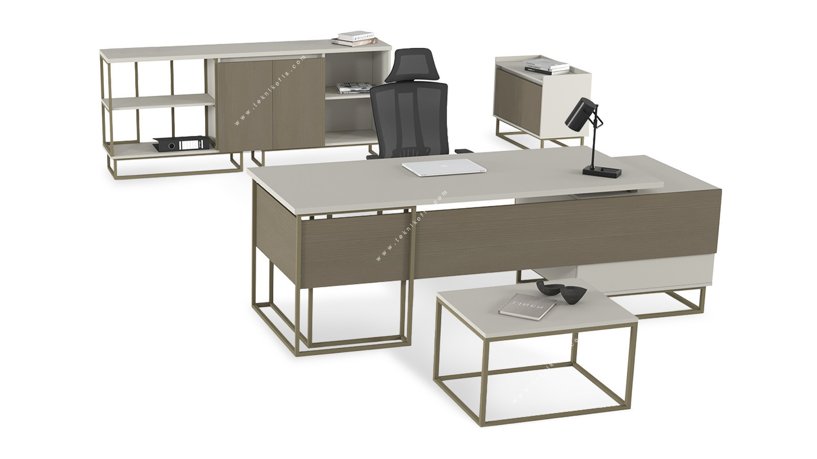 Meridian Etajerli Yönetici Takımı, yönetici odalarında profesyonel ve bütünlüklü bir ortam yaratır. Metal ayaklı yönetici çalışma masası, bağımsız etajeri, melamin dolap ve şık sehpa bir arada, modern ofis dekorasyonuna uyumlu şıklık sunar. Estetik çizgileri ve fonksiyonel depolama alanlarıyla hem kullanım kolaylığı hem görsel kalite sağlar.
