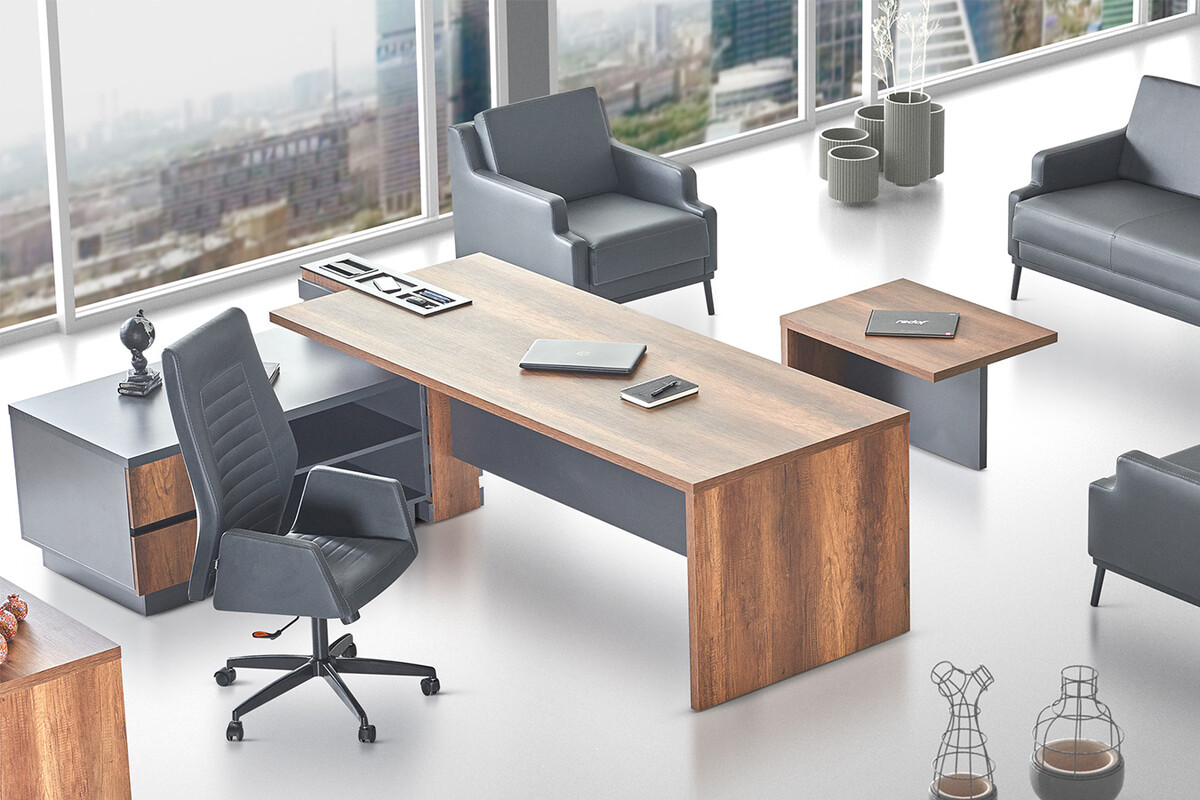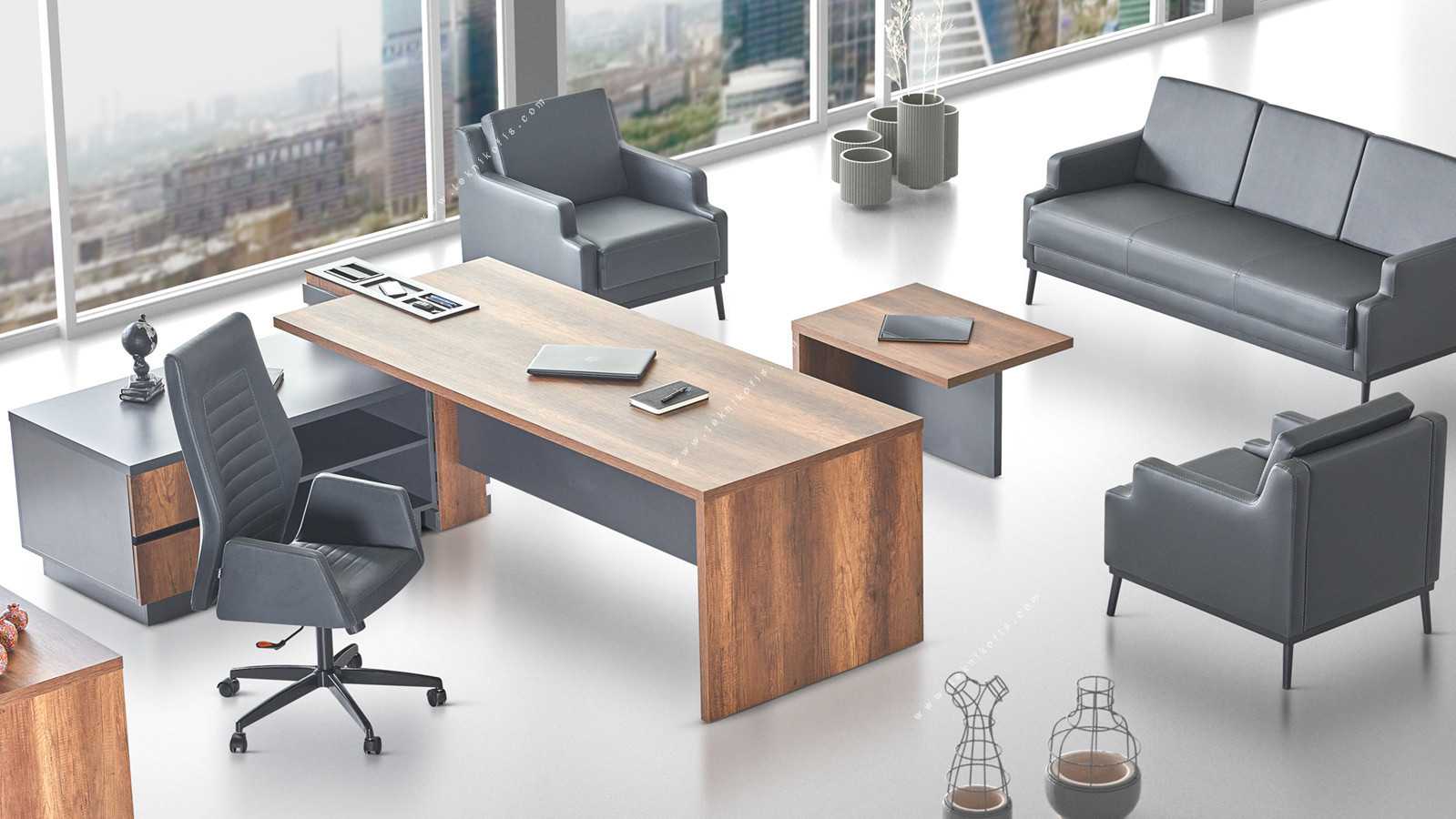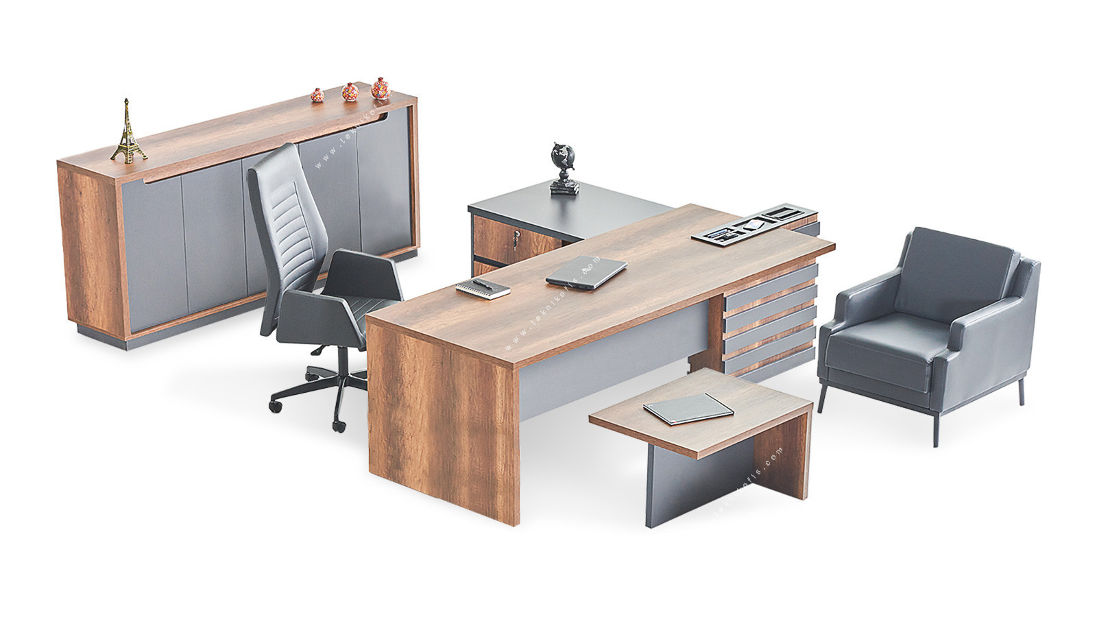 Takımın net çizgileri ve minimalist yapısı, modern ofis mimarisine mükemmel uyum sağlar. Görsel olarak etkileyici ve akılda kalıcı bir ilk izlenim yaratan ofis mobilyası takımı, iş ortamınızda güçlü bir profesyonellik ve çağdaş bir zevk yansıtır. Bu özel tasarım, ofisinizde ilham verici ve prestijli bir çalışma atmosferi oluşturmanıza yardımcı olur, mekanınıza karakter ve derinlik katar.