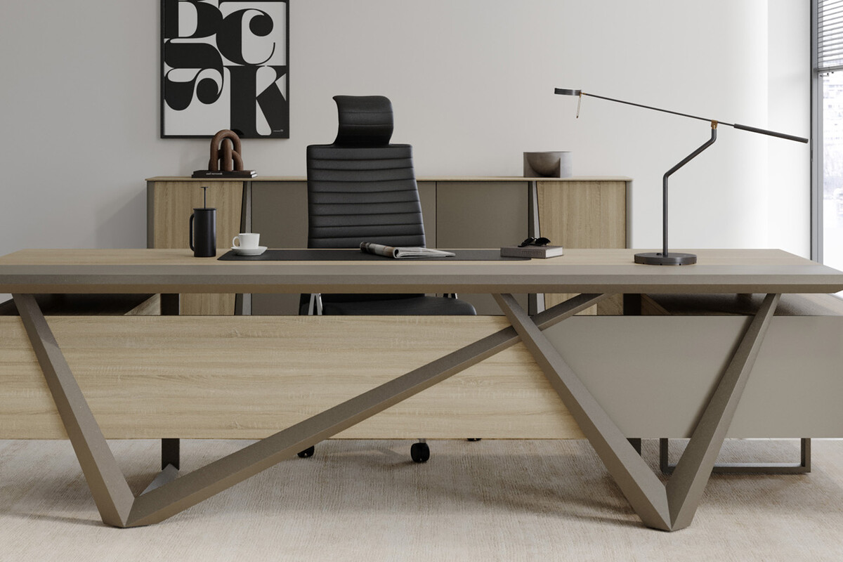 Neron Konsollu Ofis Takımı, modern ofislerin ihtiyaçları düşünülerek tasarlanmış uyumlu bir settir. Bu takım, entegre konsollu bir yönetici masası, geniş depolama imkanı sunan bir ofis dolabı ve şık bir sehpadan oluşur. Takımın her bir parçasında görülen geometrik detaylar ve profil ayaklar, tasarıma bütünlüklü bir estetik kazandırır.