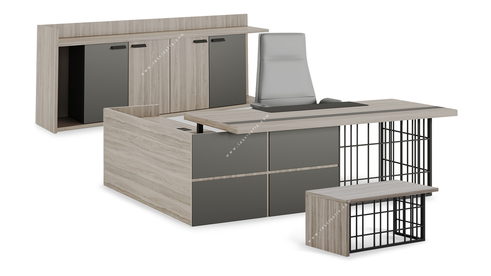 Norm Metal Ayaklı Yönetici Takımı, modern çizgileri ve güçlü duruşuyla çağdaş ofislerin vazgeçilmezidir. Geniş masa yüzeyi, belgeler, bilgisayar ve ofis aksesuarları için konforlu bir alan sunar. Metal detayları, takıma sağlamlık kazandırırken dinamik bir estetik oluşturur. Entegre etajer ve dolap, düzenli bir çalışma ortamı sağlar. Norm, tasarımıyla profesyonel gücü ve minimalist zarafeti bir araya getirir.